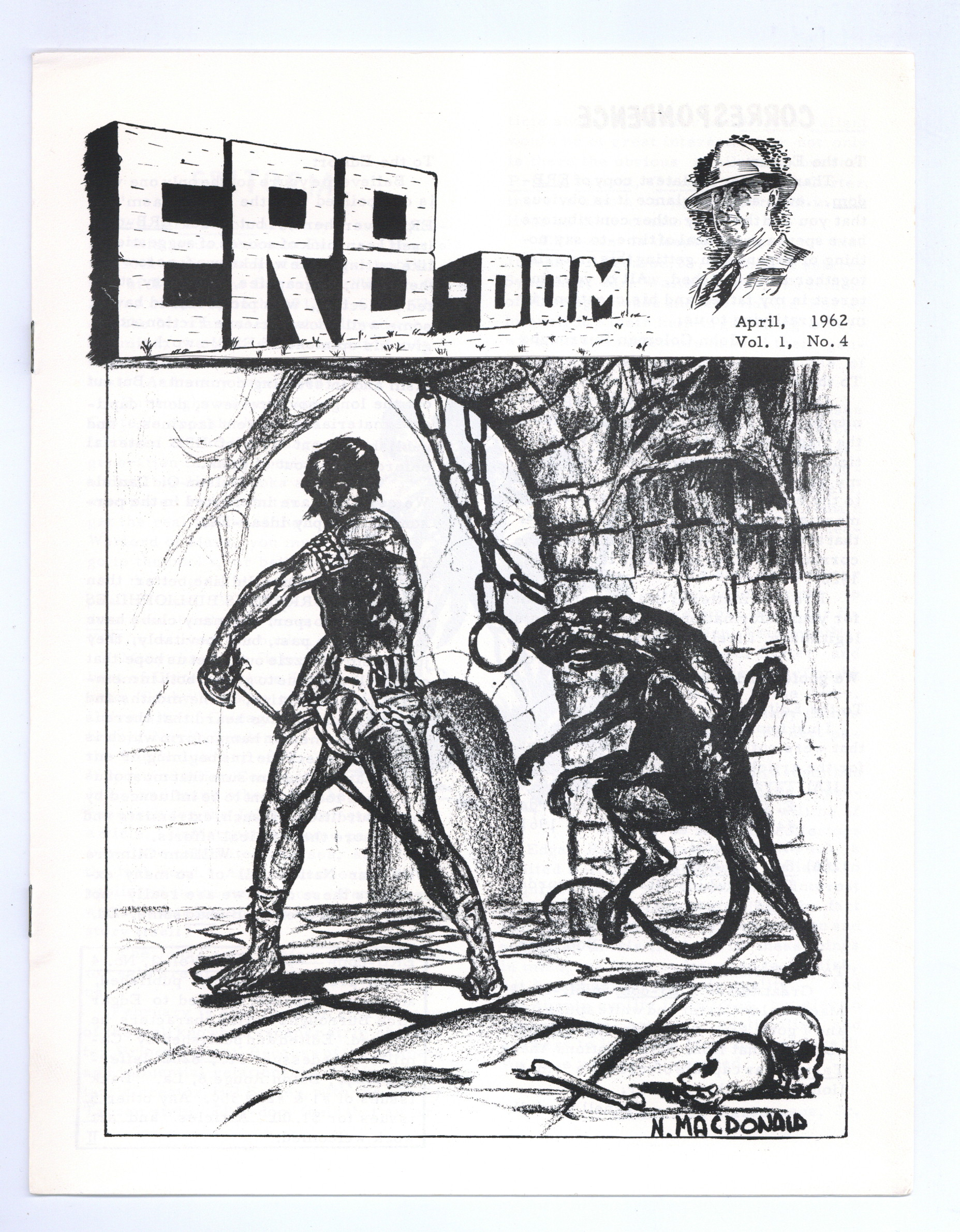 ERB-dom was one of the best fanzines focusing on Tarzan creator Edgar Rice Burroughs. Issue #4 includes the following articles: a letter from Joan Burroughs Pierce and Edgar's son John Coleman Burroughs, John Carter checklist, and Hal Foster and Prince Valiant 25 Years of Adventure (with art by Foster). 8.5 x 11; black and white, 12 pgs. April, 1962. Edited and published by Camille Cazedessus. Cover art by N. McDonald. Cover price $0.25.