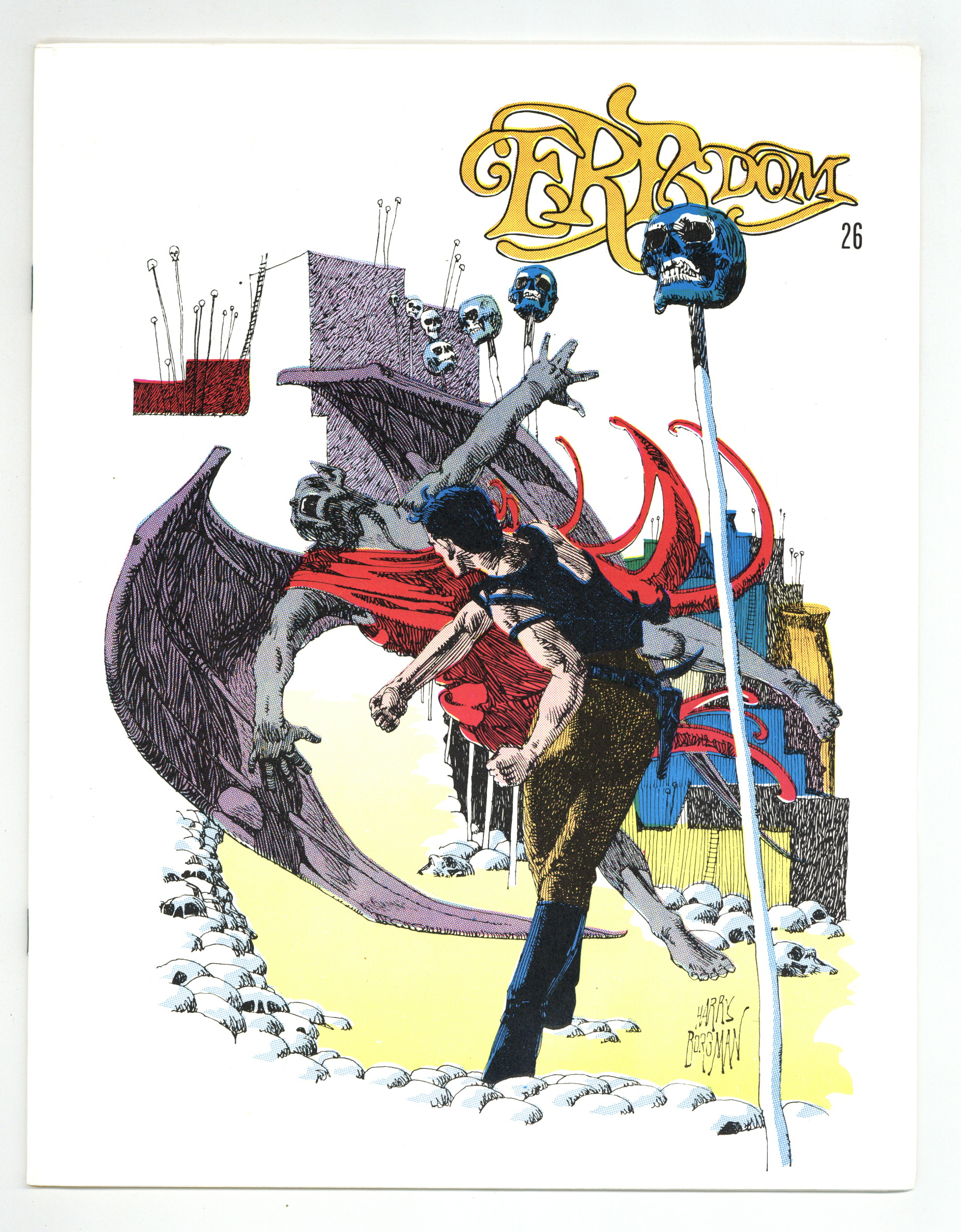 ERB-dom was one of the best fanzines focusing on Tarzan creator Edgar Rice Burroughs. Issue #26 includes the following: Basic Burroughs I, letters from Gene Roddenberry and Rick Norwood, On St. John & Dinosaurs, Tarzan Environment or Heredity, John Carter Virginian, an ad for ERB-dom A Guide to Issues 1-25 & Supplements, The British Book Scene 1917-1950, and House of Info. Cover art by Harry Borgman. 16 pgs. June, 1969. Edited and published by Camille Cazedessus. Cover price $0.50.