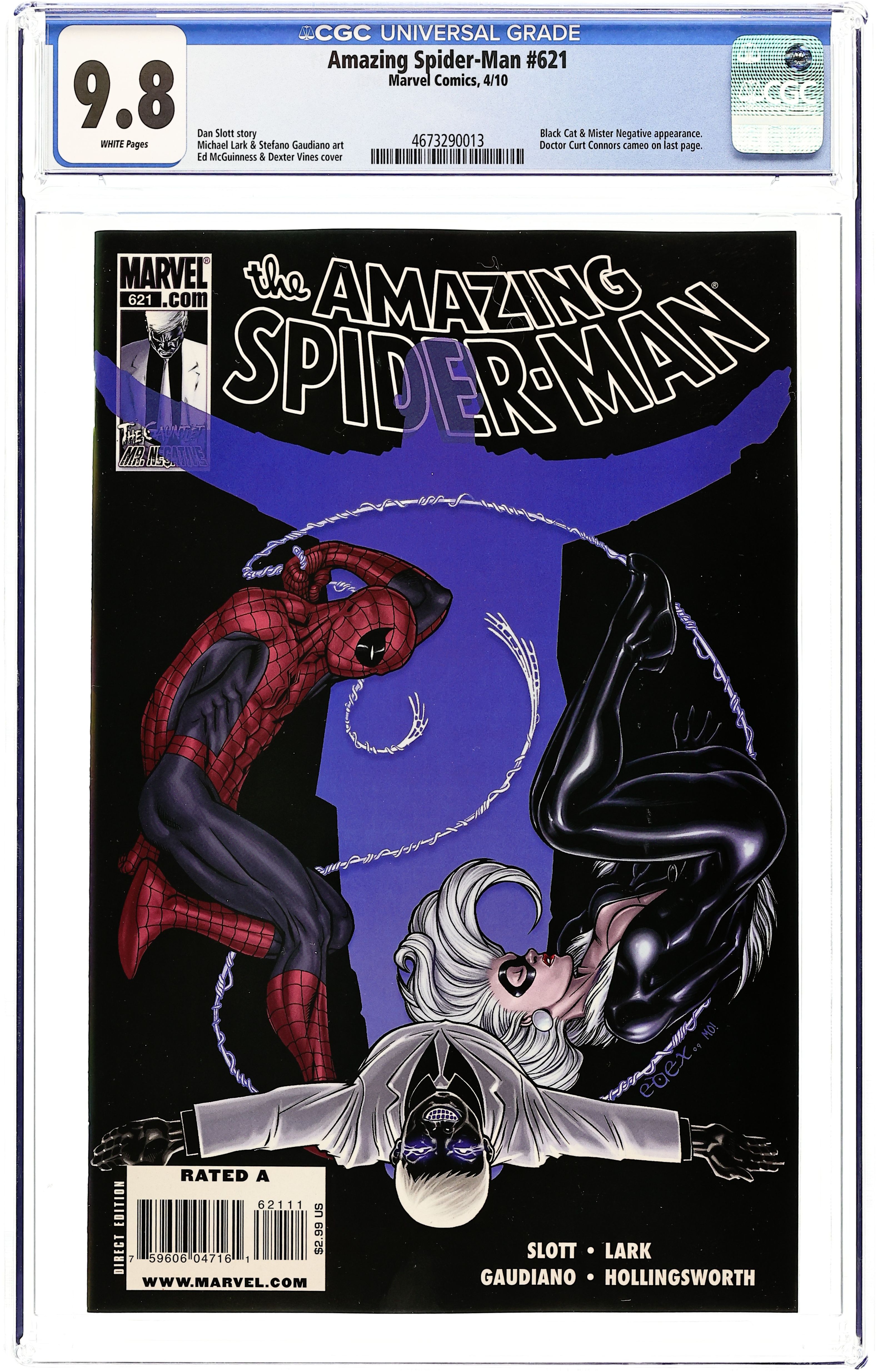 The Gauntlet: Part 7 - Written by DAN SLOTT. Art by MICHAEL LARK. Cover by ED MCGUINNESS 'Out for Blood' SPIDEY needs a favor from the BLACK CAT. Nothing big. He just needs her help stealing one of MR. NEGATIVE'S most valuable possessions. It's not like anything could go oh-so-horribly wrong! Also, in this ish: a dark turn for CARLIE COOPER, a disturbing development for CURT CONNORS, and a malicious move by...AUNT MAY?! 36 pages, full color. Cover price $2.99.