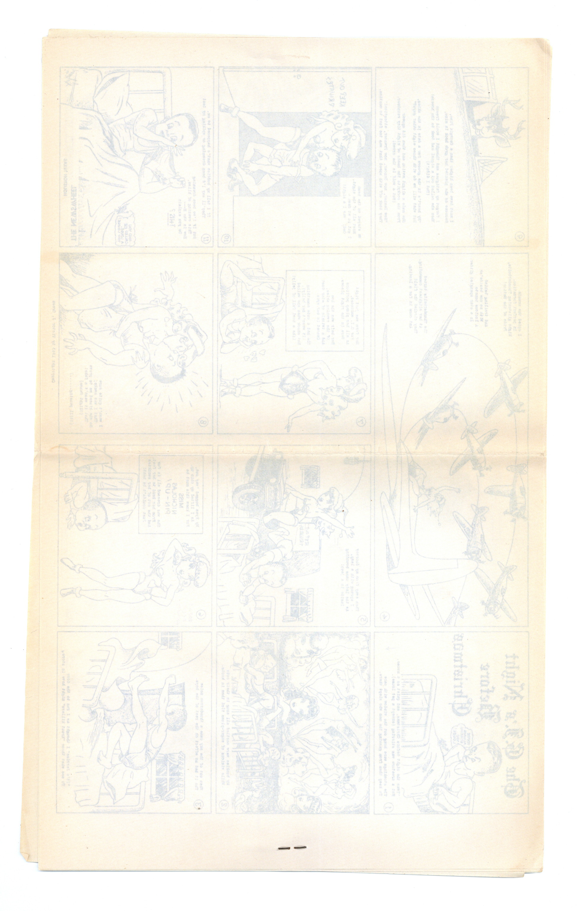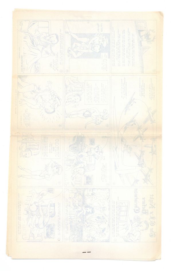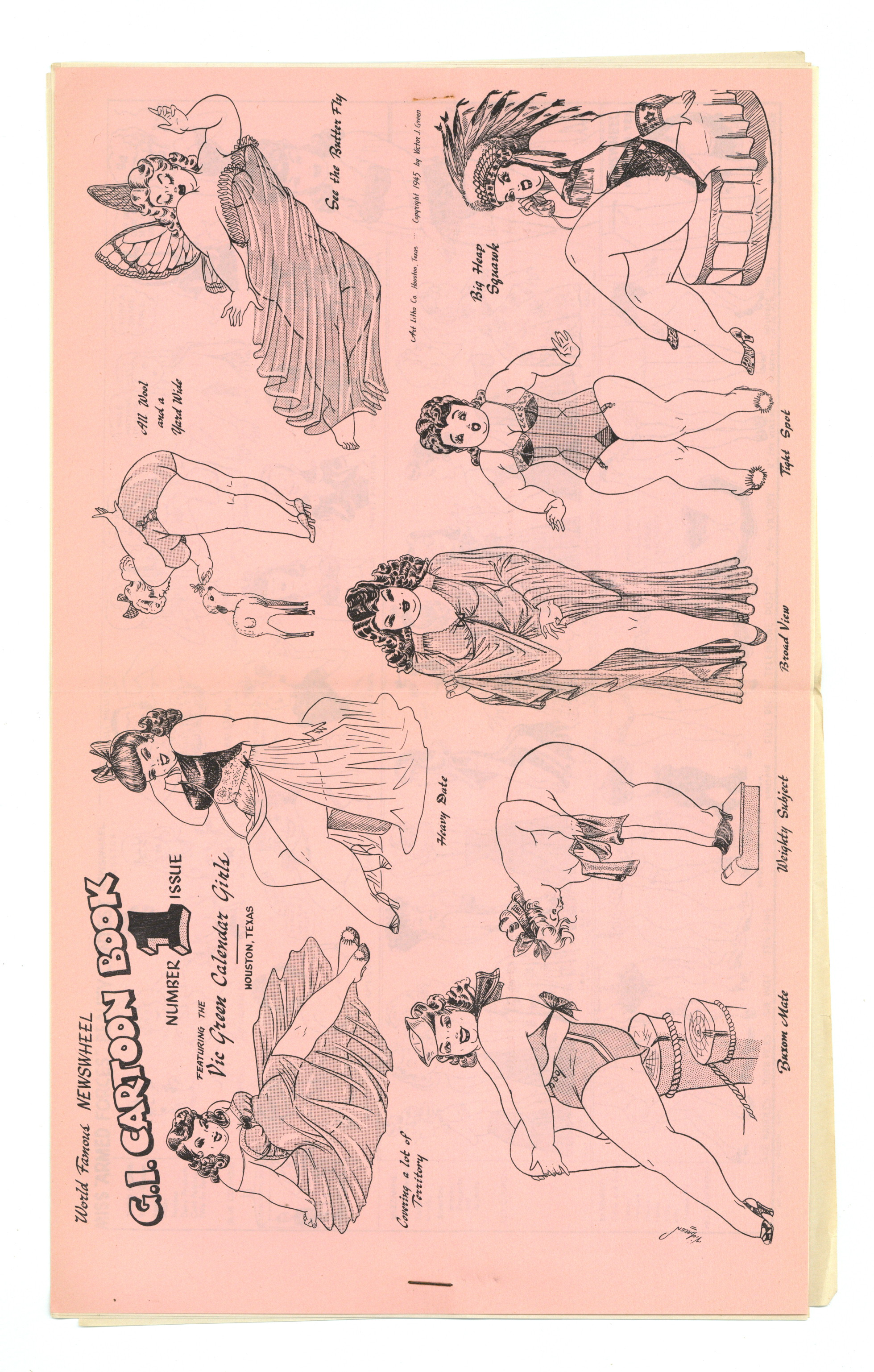 Published 1945 by Newswheel, Houston, TX.$130.00Seven 8.5" x 14" pages, printed on one side. Cartoons, gags and comic strips featuring very nice art by Victor J. Green. These booklets were created for and mailed to Service Men fighting overseas during WWII. Came in an illustrated envelope (see separate listing for envelope). Published by Art Litho Co. Houston, TX. #1 is copyrighted 1943 by Victor J. Green. Cover price $0.25.