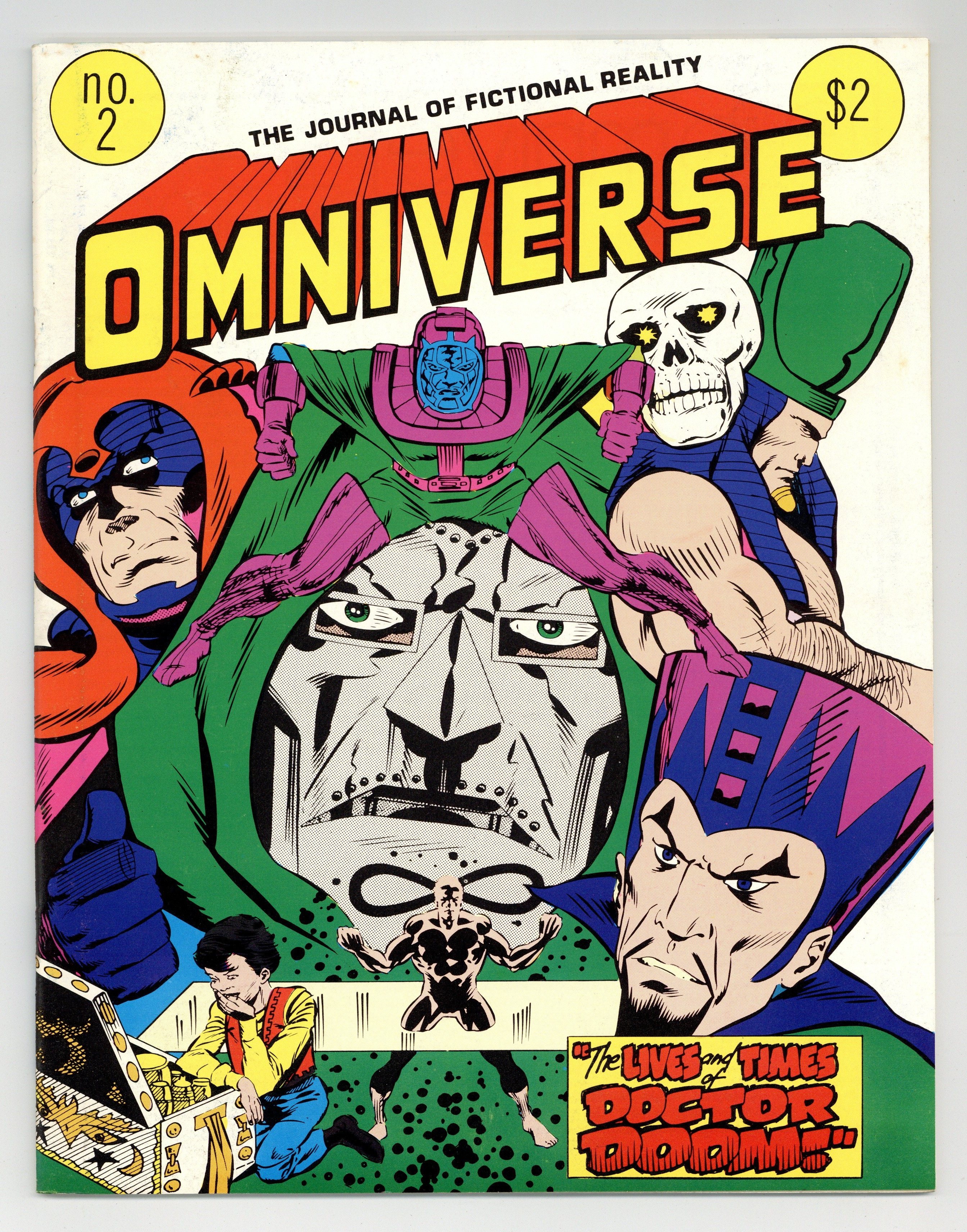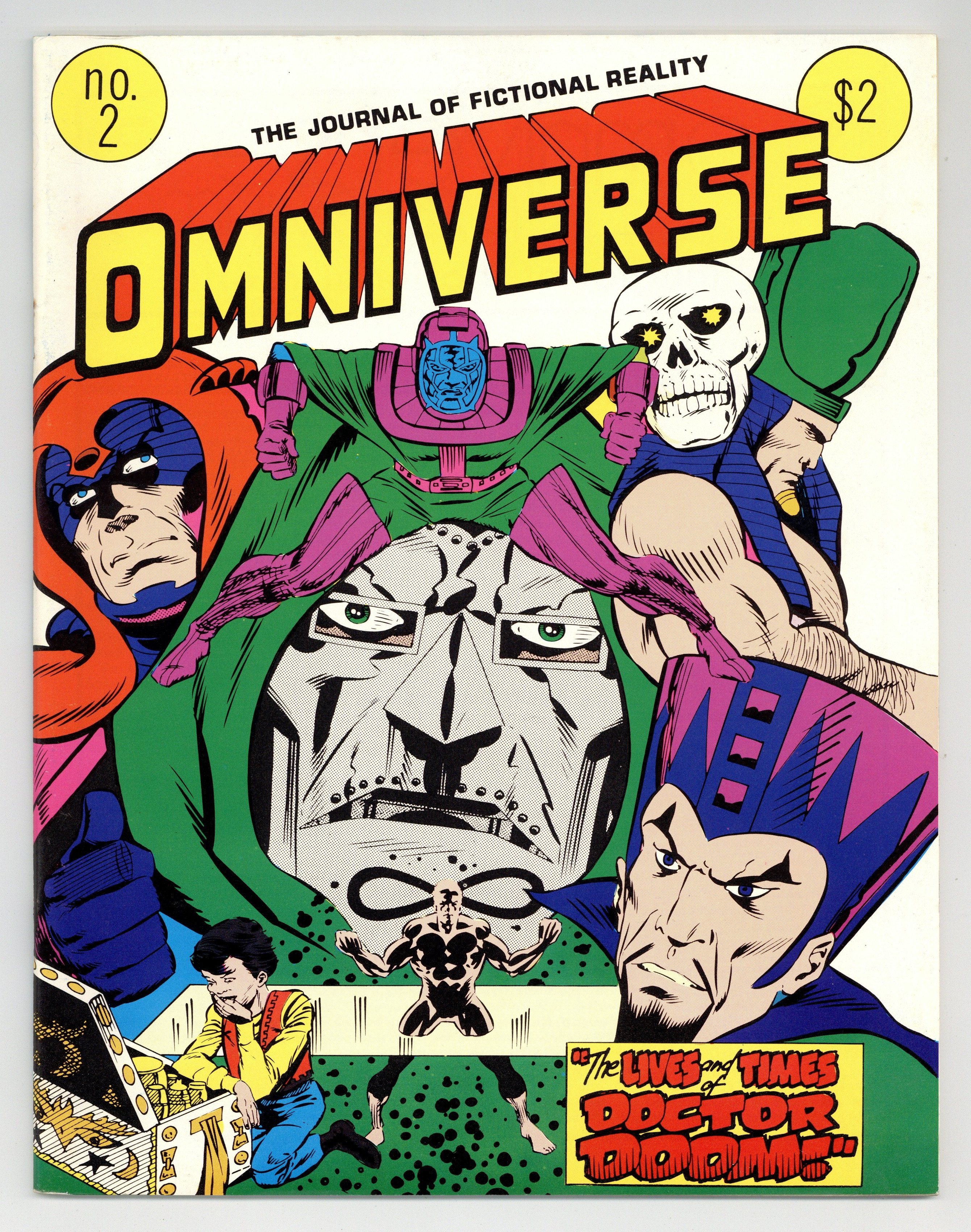 Omniverse (1979) is a fanzine published by Alternity Enterprises and edited by Mark Gruenwald. 8.5 x 10.5; black and white interiors; 48 pages. Articles: "The Source of Superman's Power," "Who Needs Comics When There Are Superheroes in Real Life?" "The Lives of Doctor Doom," "From Ragnarok to Apokolips" (by Mark Gurenwald), "Reality Spotlight: Avengers," "The Case of the Divergent Detective" (about Sherlock Holmes), comics reviews, and "Resurrection in the DC Multiverse." Writers include Peter Gillis, Frank Lovece, Rich Morrissey, Dean Mullaney, Kim Thompson, Edward Via, and others. Illustrations by Craig Anderson, Rich Bruning, Sam Dela Rosa, Dennis Jensen, and others. Back cover by Jerry Ordway. Cover price $2.00.