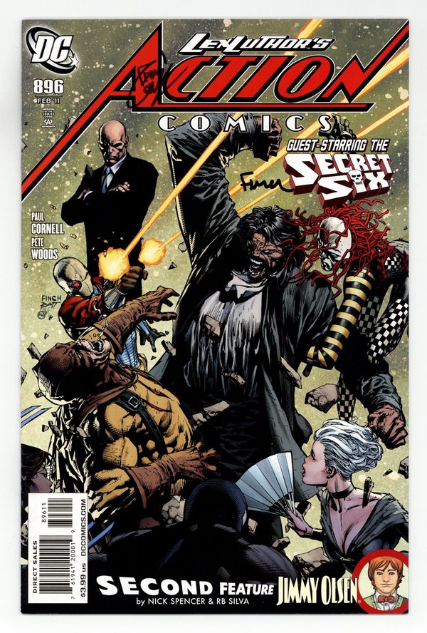 The Black Ring: Part 7 - The Secret Six crossover: Part 1 of 2 - Written by PAUL CORNELL. Co-feature written by NICK SPENCER. Art by PETE WOODS. Co-feature art by RB SILVA. Cover by DAVID FINCH. Part 1 of a 2-part crossover with the Secret Six! Lex Luthor doesn't want to get his hands dirty fighting Vandal Savage (that Black Ring energy ain't gonna find itself!), so he hires Savage's daughter Scandal and her Secret Six team to take the immortal villain down for him! Continued in Secret Six (2008 3rd Series) #29! And in the hit new JIMMY OLSEN co-feature, Jimmy signs up for a 'Win a Date' auction, but much to his surprise, so does his ex, Chloe Sullivan! While Jimmy ends up on a date with CrazyPants McGee, Jimmy's archrival snags Chloe! D'oh! And wait, are those wedding bells we hear? Better hope they don't toll for thee, Olsen! 44 Pages, Full Color. Cover price $3.99.