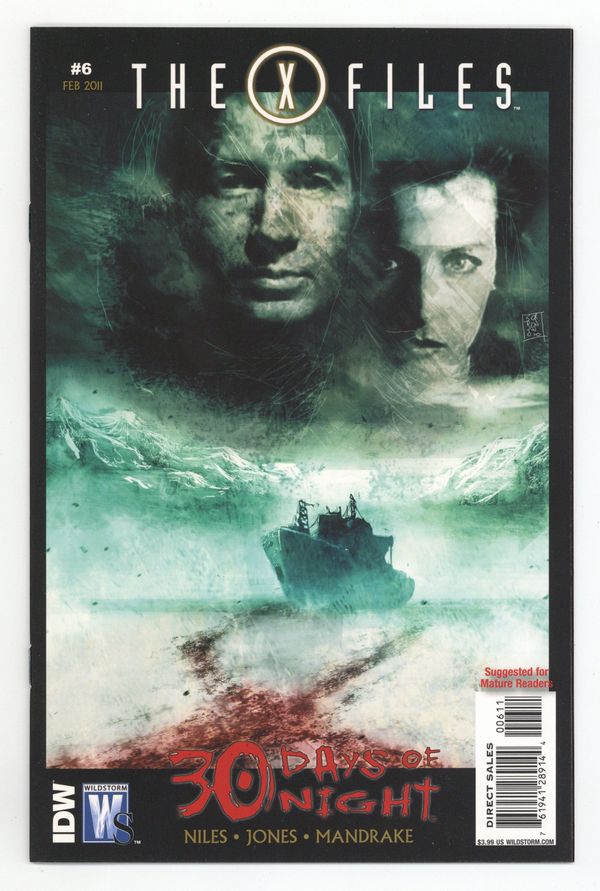 Published Feb 2011 by DC/Wildstorm.$16.00Written by STEVE NILES & ADAM JONES Art by TOM MANDRAKE Cover by ANDREA SORRENTINO FBI Agents Mulder and Scully were sent to Alaska to investigate what they thought was a ritualistic murder. But it became something bigger and scarier right before their eyes! If they survive the blood-drenched conclusion, will they ever be the same? Co-published with IDW. 32 pg, FC Cover price $3.99.