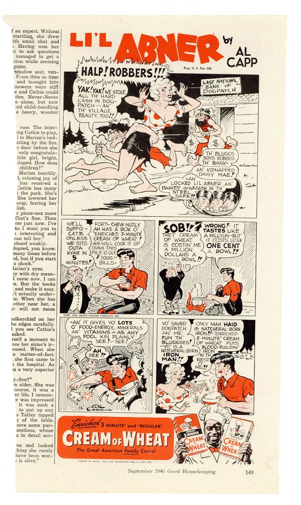 $2.65Half-page ad by Al Capp featuring Li'l Abner and the gang. Copyright 1946. Measures 5.25 in. x 14 in. or 4.75 in. x 11.5, depending upon the magazine that published the ad. Black and white plus red spot-color.