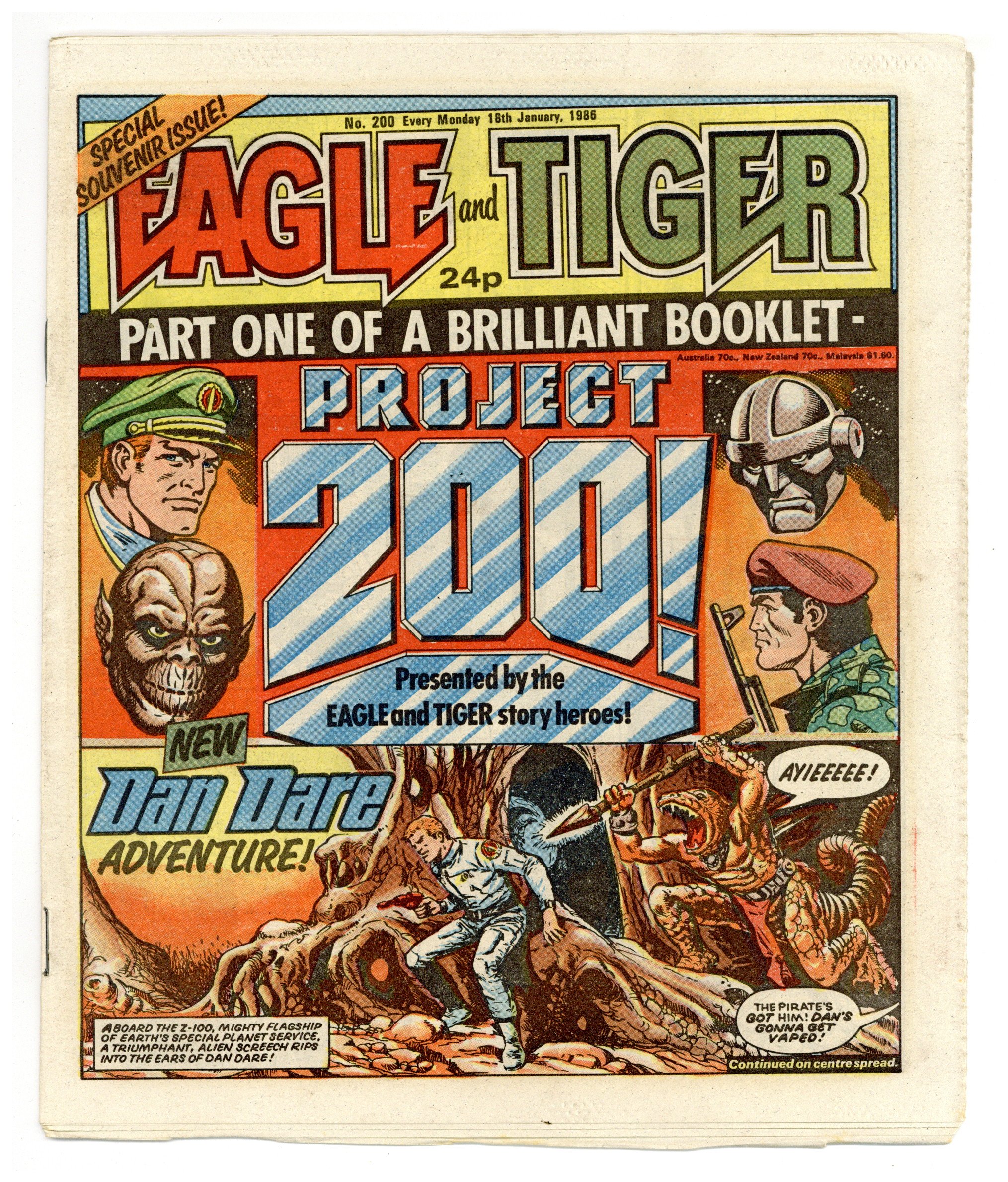 Jan. 18, 1986. "Eagle and Tiger" on cover. Dan Dare, plus other features. Published in the United Kingdom, 8-1/2-in. x 11-1/2-in, 32-pages including cover, all newsprint stock. Mix of color and black/white interior.