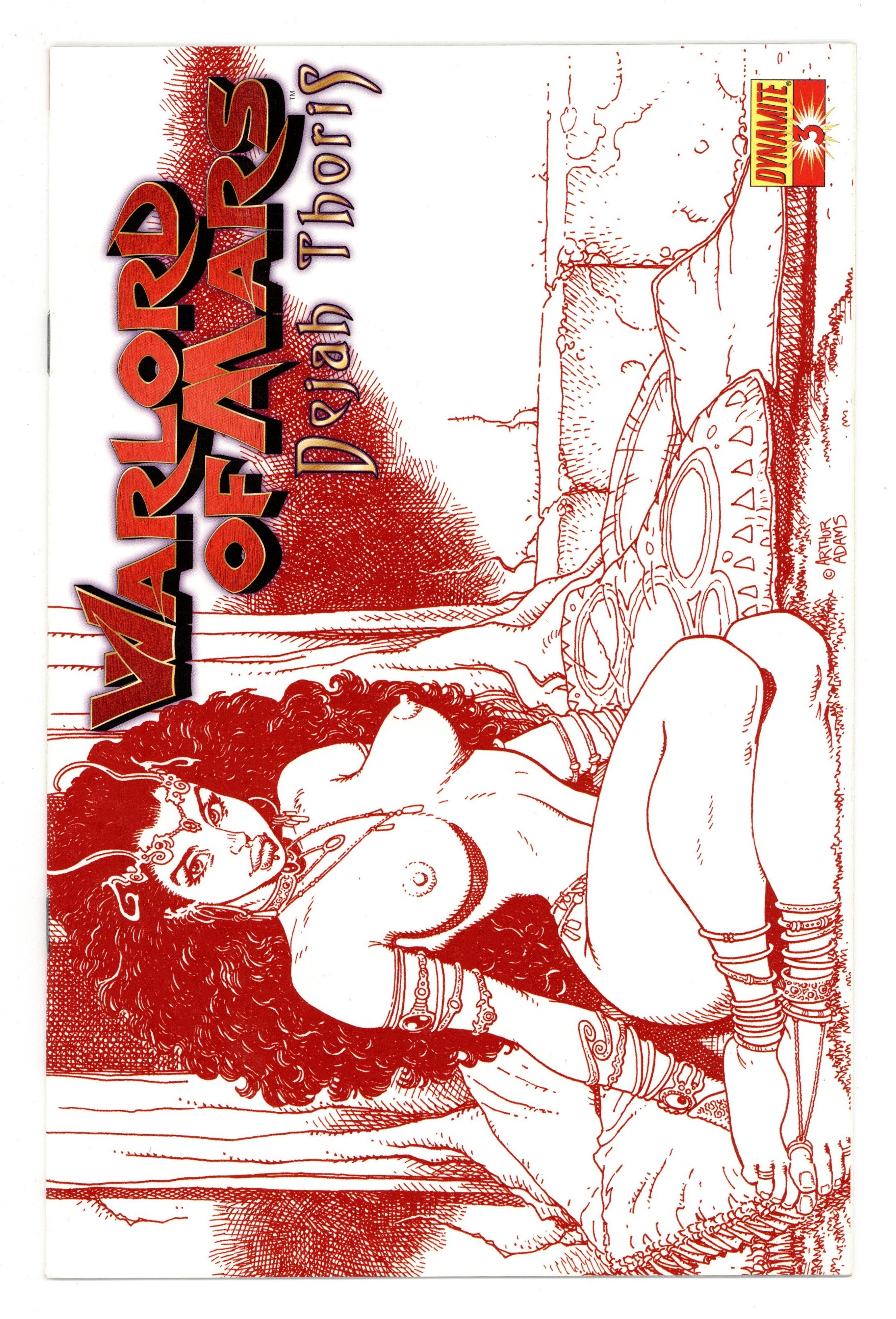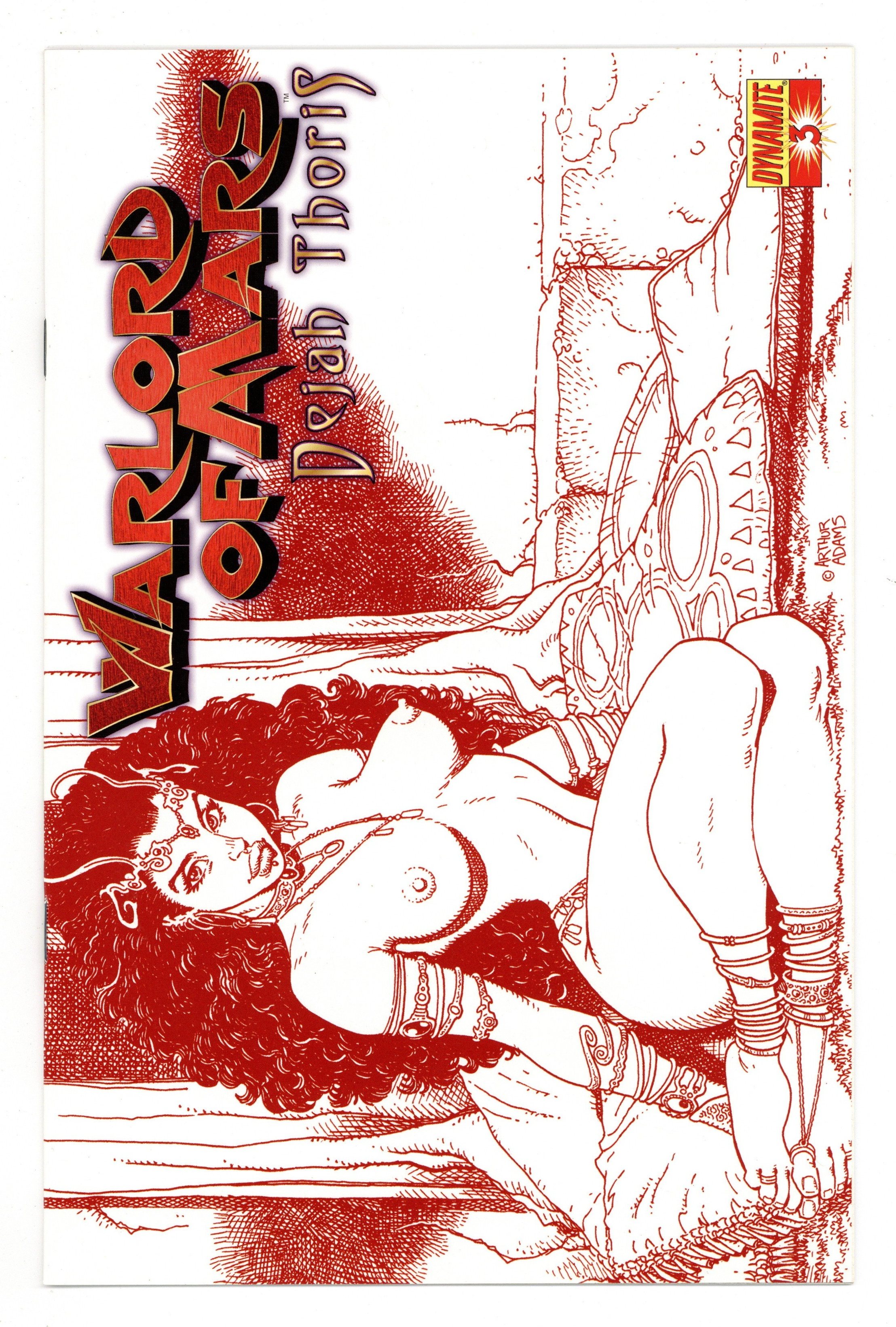 Published May 2011 by Dynamite Entertainment.$22.00Red & White Nude Variant Cover by Arthur Adams (W) Arvid Nelson (A) Carlos Rafael A horde of savage green Martians has surrounded the Warlord of Yorn in Dejah Thoris's city of Lesser Helium. No red Martian will come to the aid of a backstabbing tyrant like Yorn, but Yorn has a big surprise in store, one he paid a very high price for. While the siege rages on, Dejah Thoris fights to free her one-time enemy, the Jed of Greater Helium. Valian, Yorn's son, has thrown in his lot with Dejah. It's only a matter of time before his father finds out... Cover price $3.99.