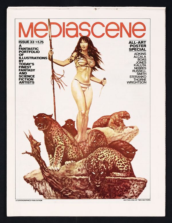 Published 1978 by Supergraphics.$45.00Jim Steranko's fine zine covering popular entertainment. Tabloid newspaper format (all issues come folded) but on good quality white paper stock. Art pin-up issue featuring work by Steranko, Barry Windsor-Smith, Jeff Jones, Michael Kaluta, Berni Wrightson, Craig Russell, Rudy Nebres, Alfredo Alcala, Frank Thorne, and others. Cover price $1.75.