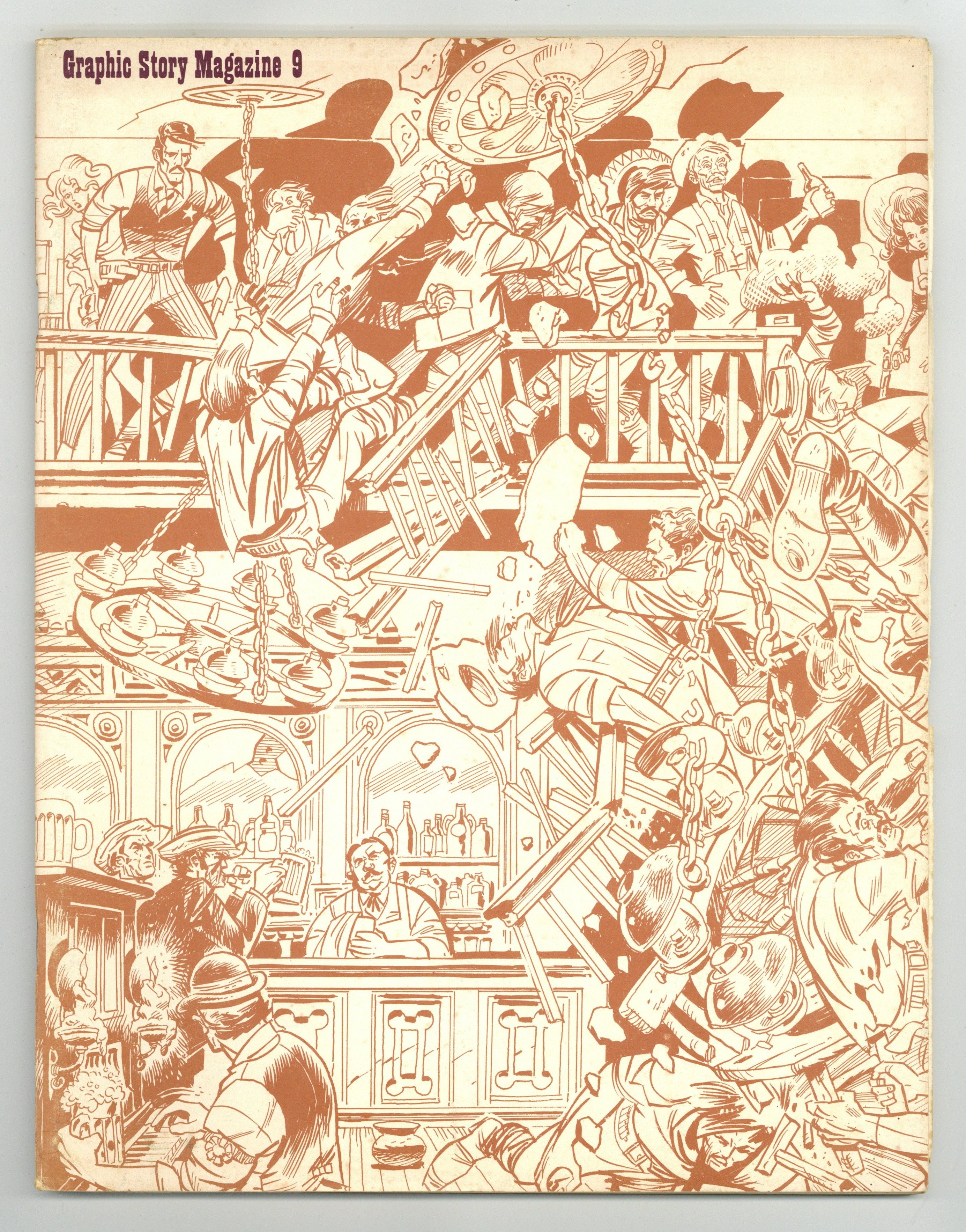 2nd printing. Issue #9 of Graphic Story Magazine (formerly Fantasy Illustrated) includes the following: letters by artist Jeff Jones, Comics Revue editor Rick Norwood, Romance Without Tears editor John Benson, and comic book editor Archie Goodwin; "Master Tyme Mobius Tripp" strip by George Metzger; an interview with Dan Noonan (including bibliography); The Sons of Aesop funny animals column by Mike Barrier; The Last Weapon strip by Vincent Davis (based on a story by Robert Sheckley); and cover art by Tom Sutton. Summer, 1968. 48 pgs. Cover price $0.75.