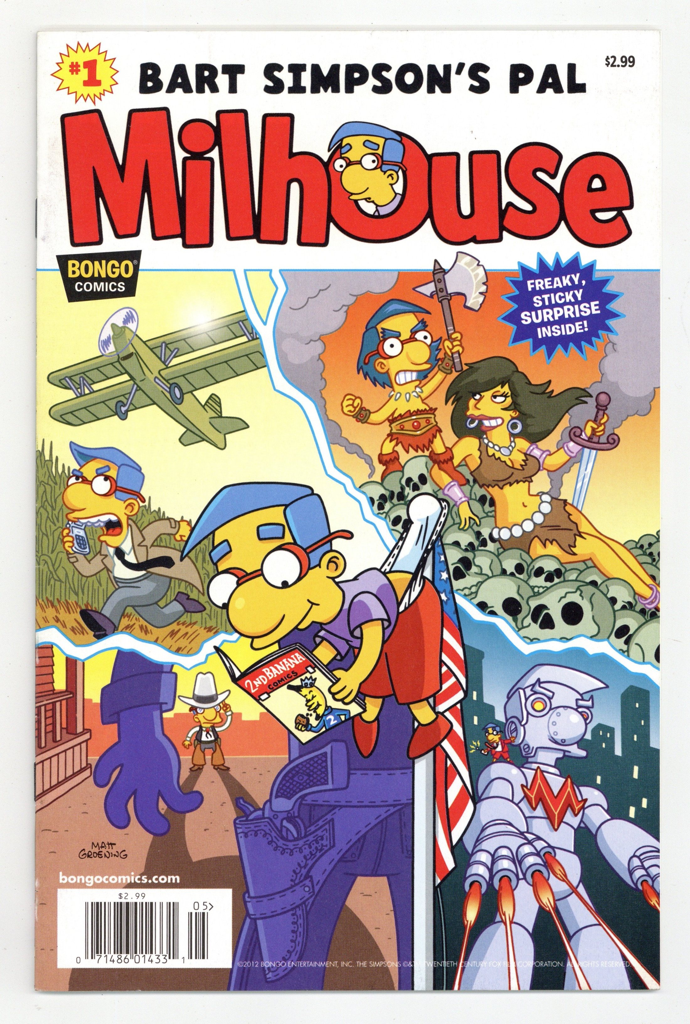 $19.00(W) Pat McGreal, Gail Simone (A) Bob Smith, Carol Lay Bart Simpson's pal Milhouse takes center stage in the next of our series of Simpsons Comics One-Shots. Take a look at the world of Springfield through the eyes of Bart's bespectacled best friend, second banana, and juvenile delinquent wannabe, and the fantastical things you see through his thick lenses might surprise you. Cover price $2.99.