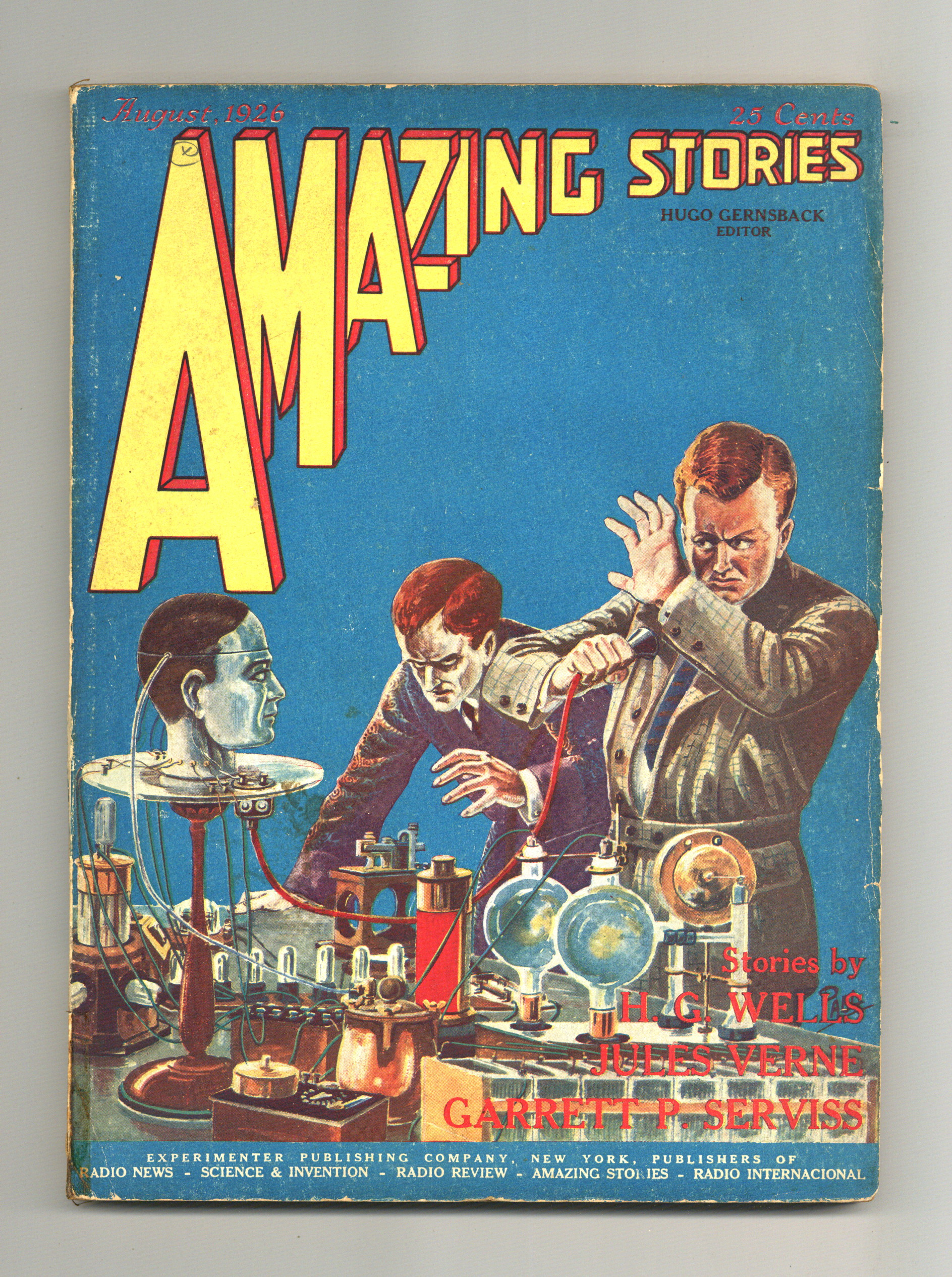 August 1926. Stories by H.G. Wells ("The Empire of the Ants"), Jules Verne ("Doctor Ox's Experiment"), Garrett P. Serviss, Jacque Morgan, M.H. Hasta, Albert B. Stuart, and G. McLeod Winsor. Edited by Hugo Gernsback. 8-in. x 11-in.; black and white with color cover; 96 newsprint pages. Cover price $0.25.