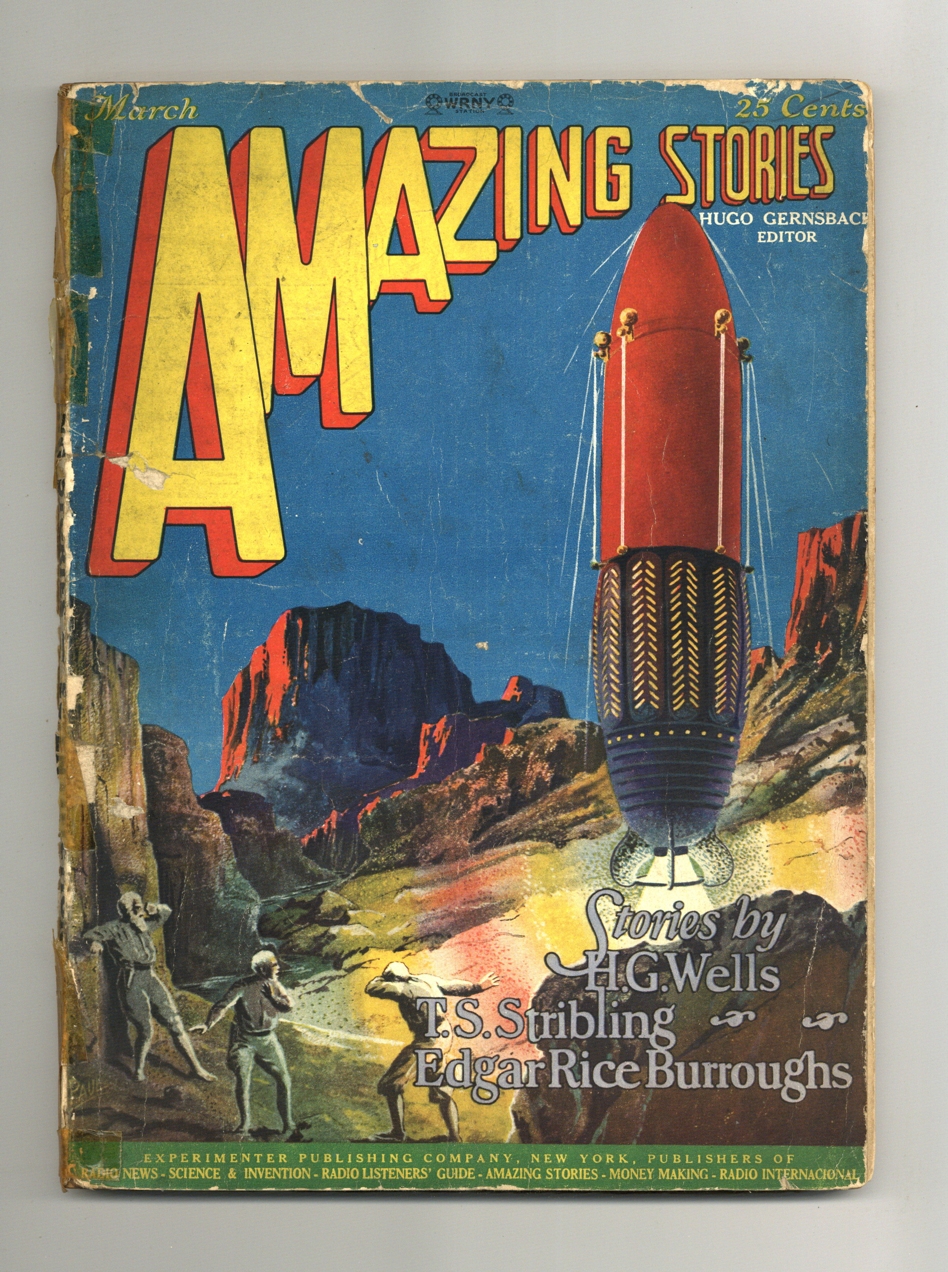 March, 1927. Cover art from "The Green Splotches" by T.S. Stribling. Stories by H. G. Wells ("Under the Knife"), Edgar Rice Burroughs ("The Land That Time Forgot"), and many more. 8-in. x 11-in.; black and white with color cover; 96 newsprint pages. Edited by Hugo Gernsback. Cover price $0.25.