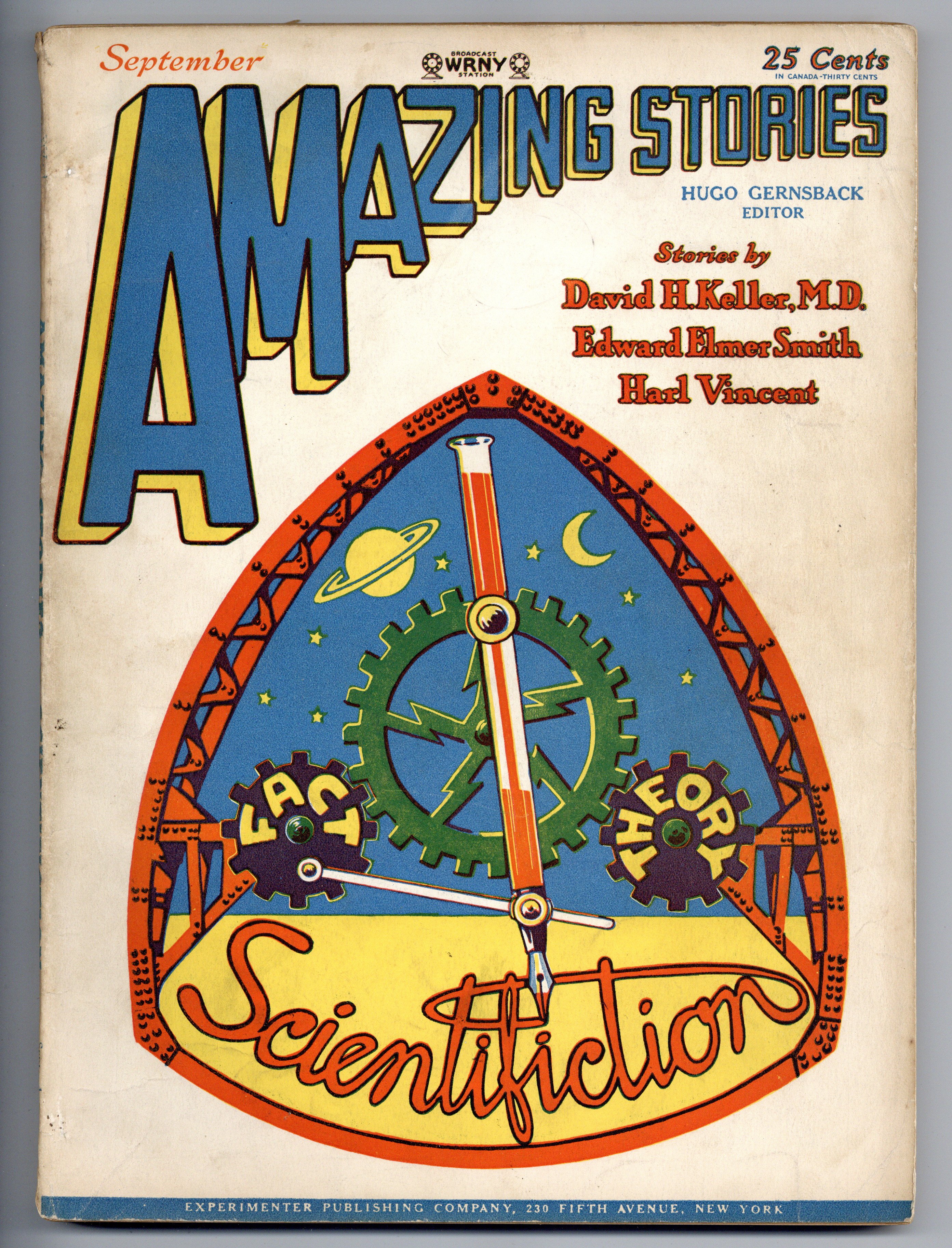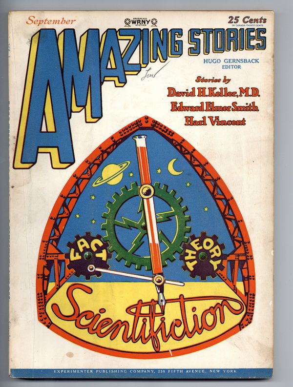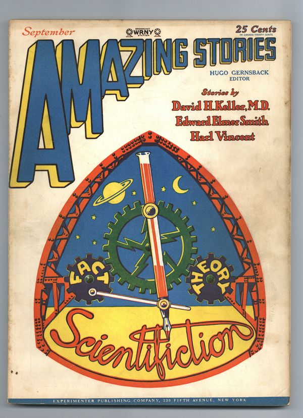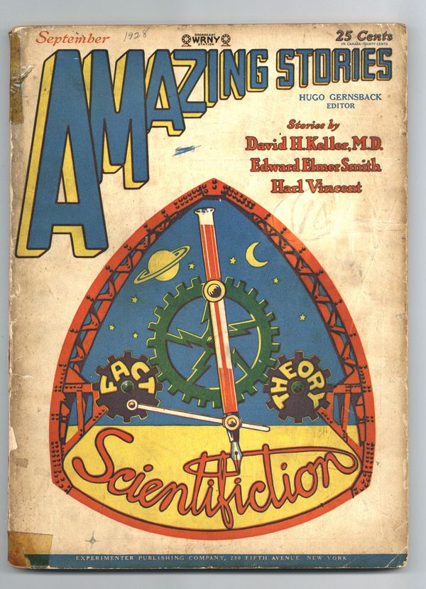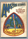 September 1928. 1st appearance of the Amazing Stories "scientifiction" logo. Stories by David H. Keller, M.D. ("Unlocking the Past"), Edward Elmer Smith ("The Skylark from Space" part 2), Harl Vincent ("The Ambassador from Mars"), and more. Edited by Hugo Gernsback. 8" x 11"; black and white with color cover. Cover price $0.25.