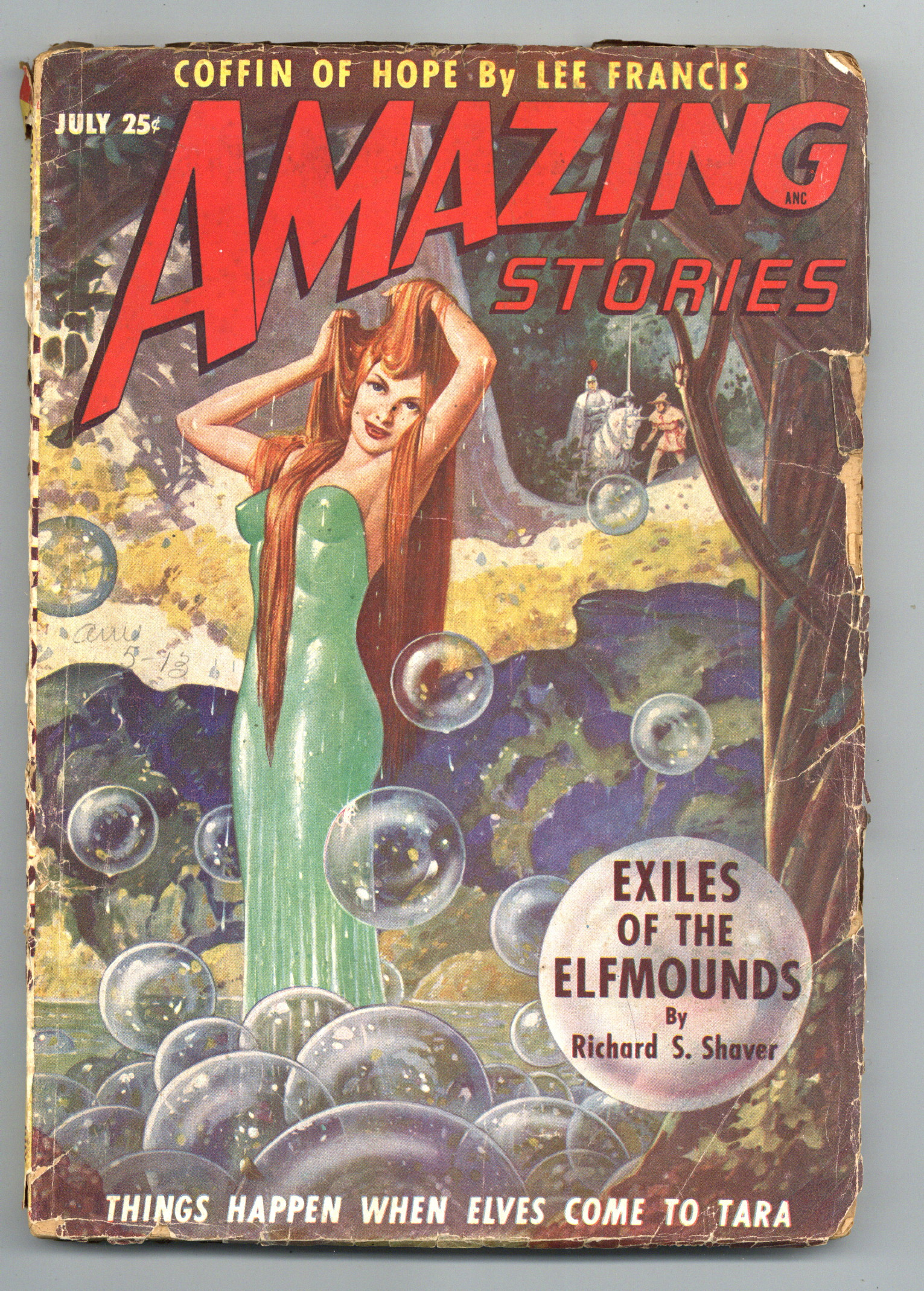 Volume 23, Issue 7 - July, 1949. Science fiction stories by Richard S. Shaver, Lee Francis, Cavid C. McGowan, Rog Phillips, Ruppert Carlin, Charles Recour, G.L. Cleggett, and Guy Archette. Illustrations by Murphy Anderson (2 stories), Edmond B. Swiatek, Rod Ruth, and Julian S. Krupa. Cover by Robert Gibson Jones. 7-in. x 10-in.; black and white; 148 newsprint pages. Cover price $0.25.