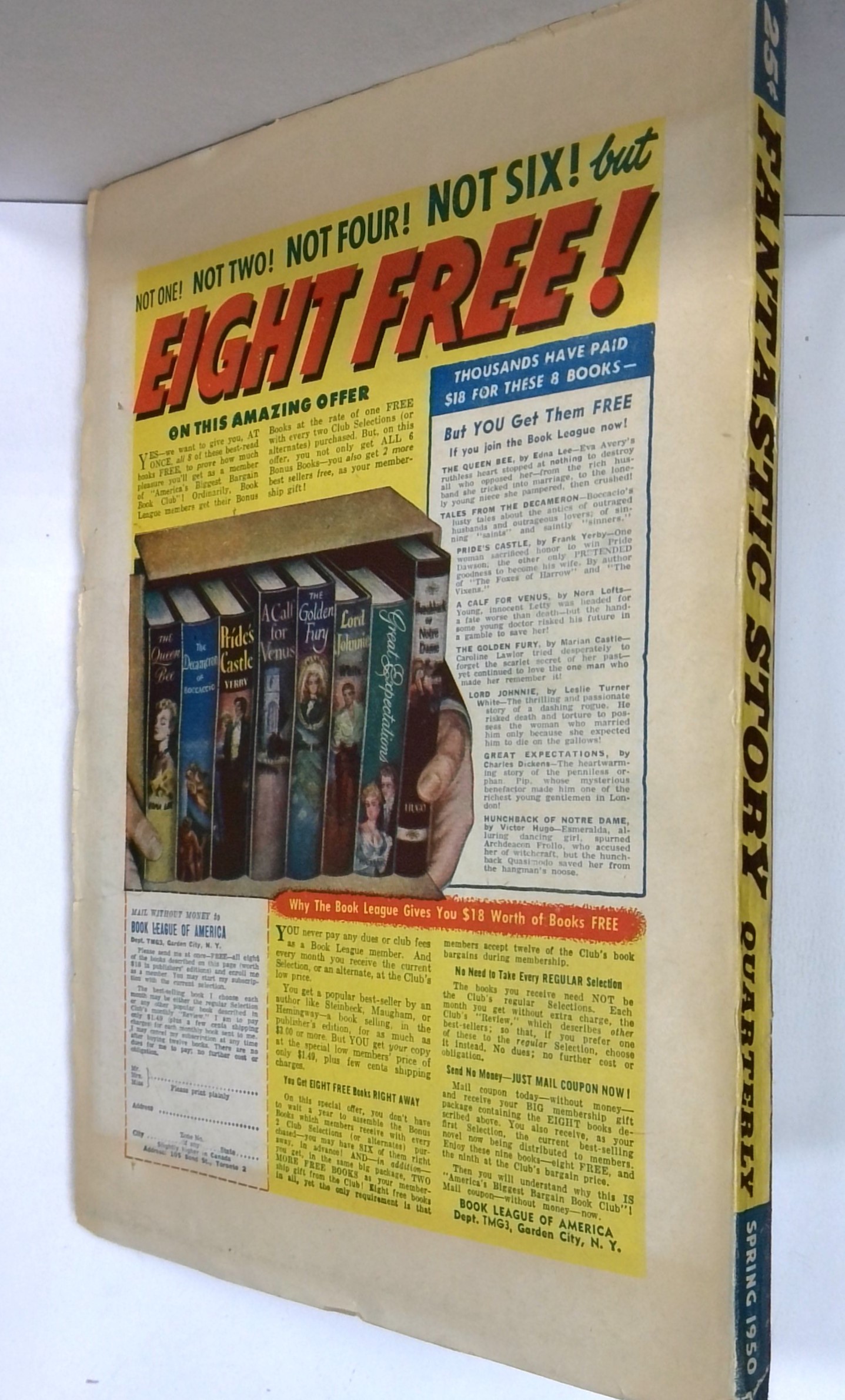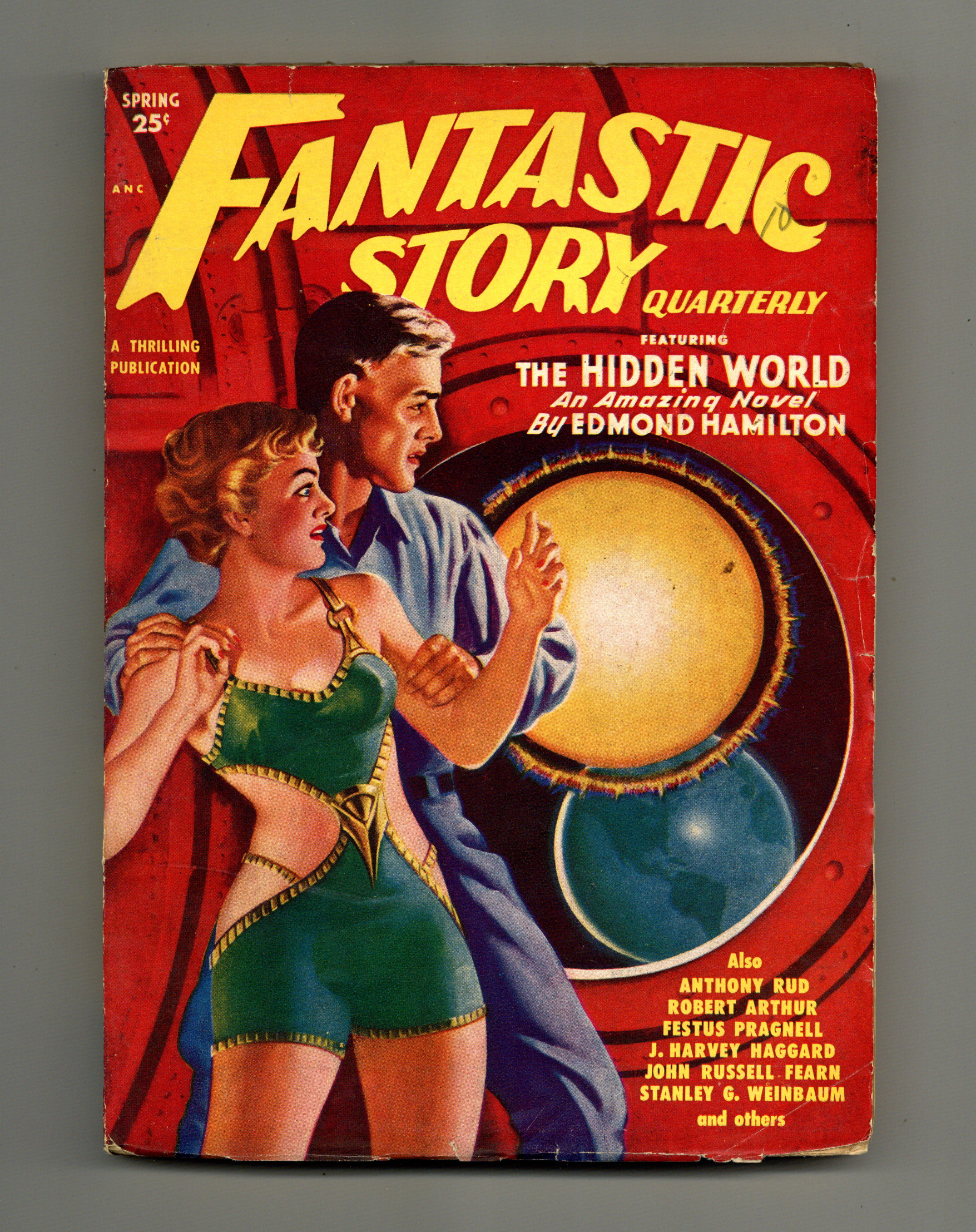 Spring 1950. "Trespass!" 1st published science fiction by Gordon R. Dickson (done in collaboration with Poul Anderson). Stories by Edmond Hamilton, Festus Pragnell, J. Harvey Haggard, Anthony Rud, Raymond Z. Gallun, Carter Sprague, Stanley G. Weinbaum, John Russell Fearn, and Robert Arthur. One Virgil Finlay illustration. 7-in. x 9.75-in.; black and white; 166 pages. Cover price $0.25.