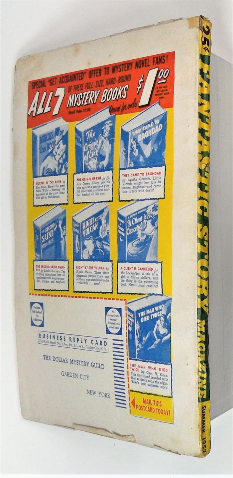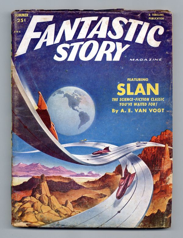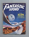 Summer 1952. Stories by A.E. Van Vogt (reprinting his classic "Slan"), Daniel Keyes, Leigh Brackett, Raymond Z. Gallun, Mari Wolf, and Larry Clinton. Virgil Finlay (3) and Alex Schomburg illustrations. Schomburg cover. 7-in. x 9.75-in.; black and white; 144 pages. Cover price $0.25.