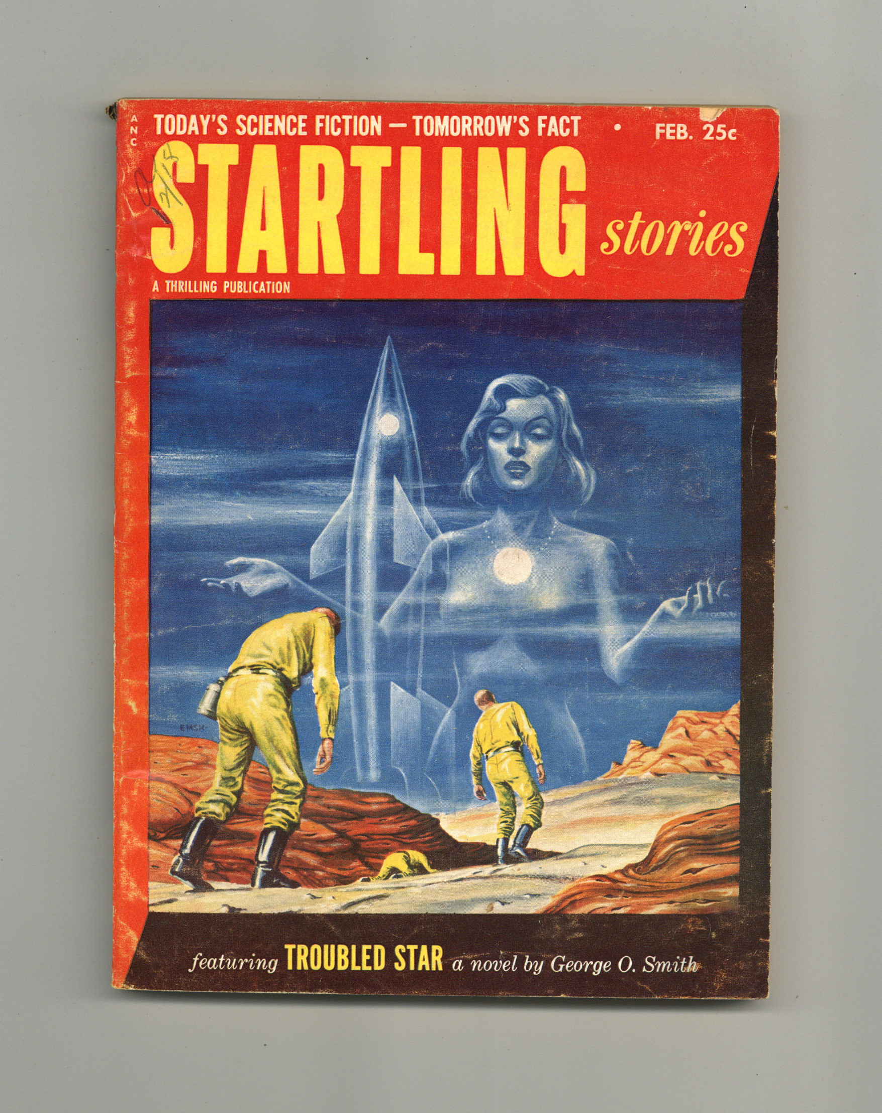 February 1953. Cover by Ed Emshwiller. Stories: "Troubled Star" by George O. Smith, "Potemkin Village" by Fletcher Pratt, "The Monkey's Fingers" by Isaac Asimov, "Definition" by Damon Knight, and "Sestinia of the Space Rocket" a poem by Philip Jose Farmer. Softcover Pulp, 6 1/2-in x 9-in, 146 Pages, B&W. Cover price $0.25.