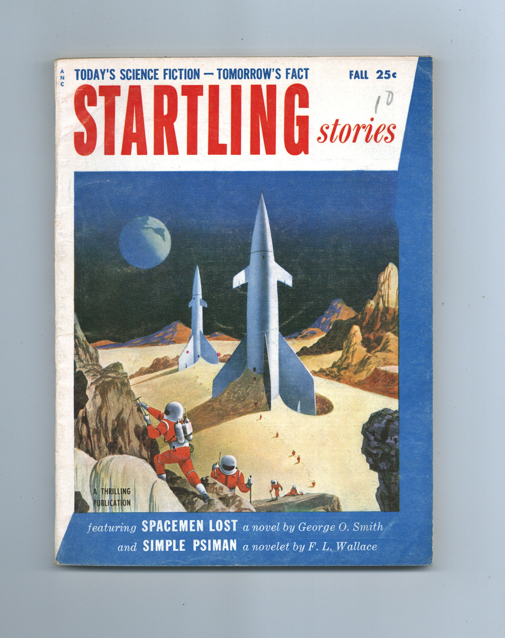 Fall 1954. Cover by Alex Schomburg. Stories by George O. Smith, F.L. Wallace, William Sambrot, and Margaret St. Clair. Virgil Finlay (2), Alex Schomburg, and Emsh illustrations. Schomburg cover. 6.5-in. x 9-in. trimmed format; black and white; 118 pages. Cover price $0.25.