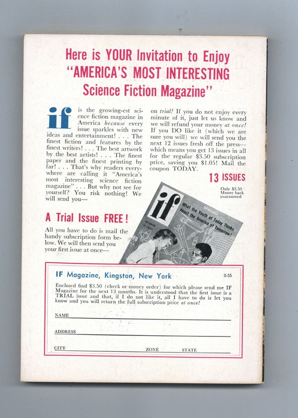 Published Mar 1955 by Quinn Publishing Co..$25.00March 1955. Science fiction stories by Philip K. Dick, Lee B. Holum, Charles L. Fontenay, Chad Oliver, Frank Riley, G.K. Hawk, and Jerry Sohl. Three Kelly Freas illustrations. Cover by Mel Hunter. 5.25-in. x 7.5-in.; black and white; 120 newsprint pages. Cover price $0.35.