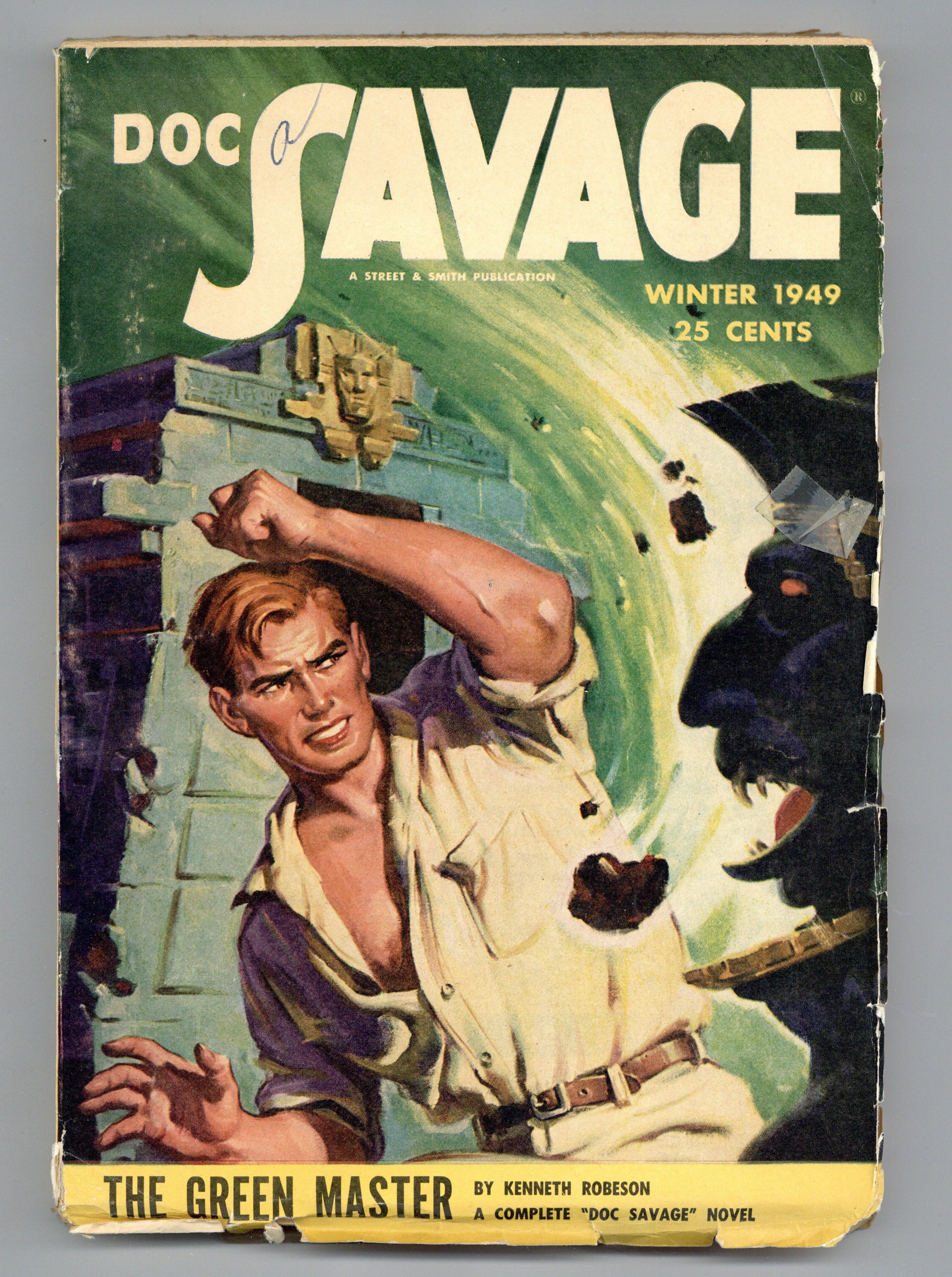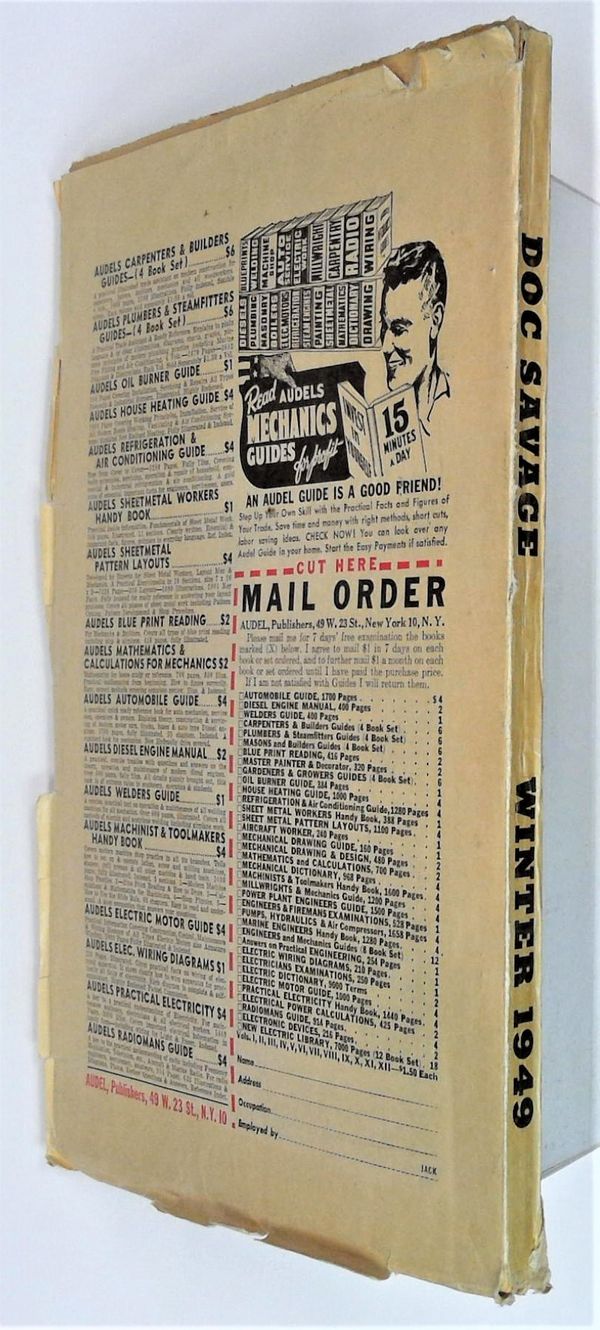 Winter 1949. Return to pulp format. Cover by G. Rozen. "The Green Master," a Doc Savage novel by "Kenneth Robeson"; "From Singapore to Sydney" by Allan R. Bosworth; "The Phantom Witness" by Ronald Henderson; "Copperhead's Last Trick" by H.M. Sutherland; "A Man for the Privateer" by John Prescott; "Eyes in the Dark" by Dorothy Dunn; and "Keeping Honest" by Larry Holden. 6.75-in. x 9.75-in.; black and white; 128 newsprint pages Cover price $0.25.
