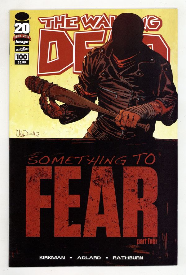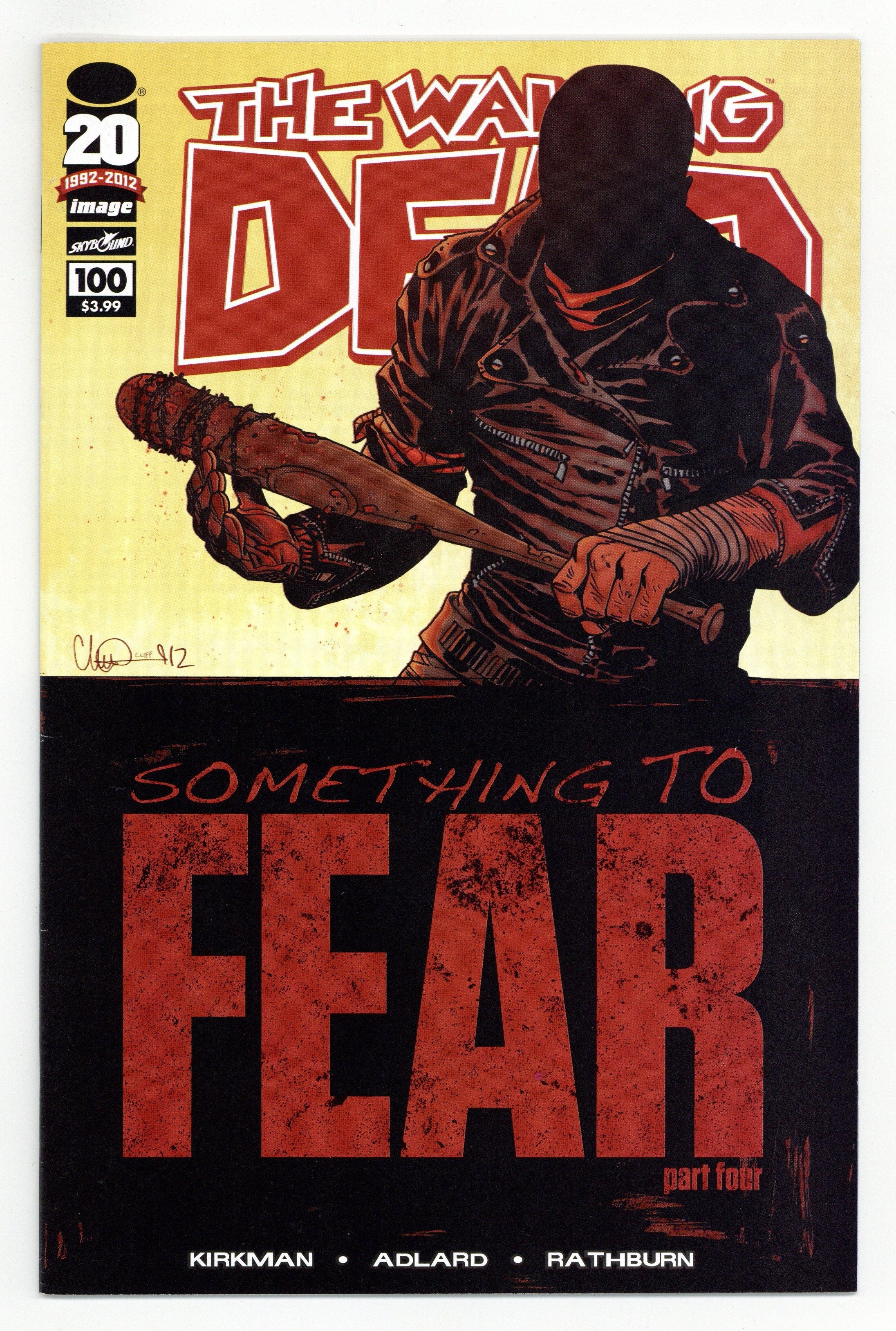 $16.00Cover by Charlie Adlard. First appearance of Negan & "Lucille", Death of Glenn. Something to Fear: Part 4 of 6 - (W) Robert Kirkman (A) Charlie Adlard, Cliff Rathburn 'SOMETHING TO FEAR' CONTINUES! This extra-sized chapter contains one of the darkest moments in Rick Grimes' life, and one of the most violent and brutal things to happen within the pages of this series. 100 issues later, this series remains just as relentless as the debut issue. Do not miss the monumental 100th issue of THE WALKING DEAD! NOTE: 1st Appearance of of Negan & Lucille. Cover price $3.99.