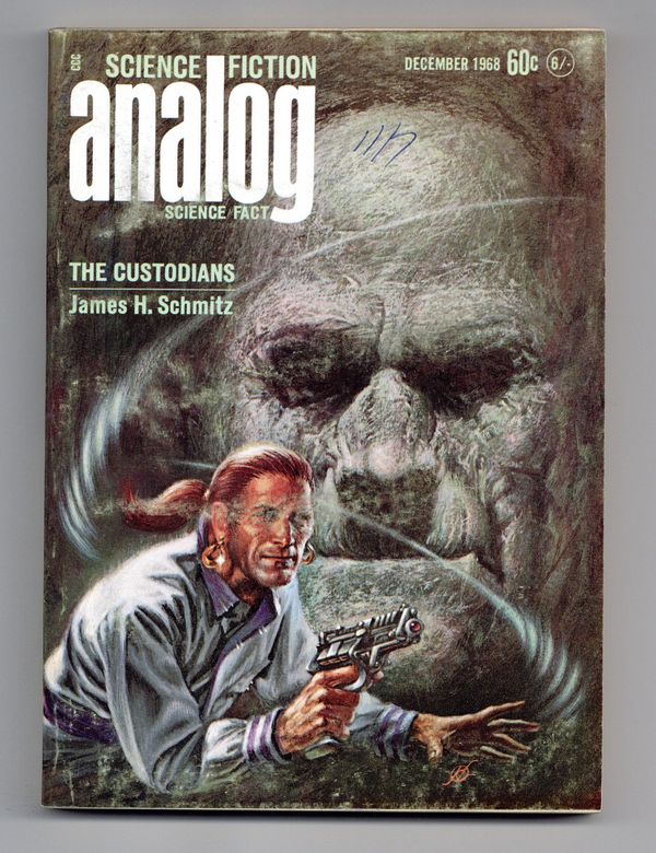 Published Dec 1968 by Dell Magazines.$5.20December 1968. Stories: "The Custodians" by James H. Schmitz, "The Reluctant Ambassadors" by Stanley Schmidt, "Pipeline" by Joe Poyer, "A Learning Experience" by Theodore Liltwell, and "The Form Master" by Jack Wodhams. Science Fact feature, "Situation of Some Gravity" by Joseph F. Goodavage. Cover by Kelly Freas. Illustrations by Kelly Freas and Leo Summers. Softcover, 5.5-in. x 7.5-in.; 178 newsprint pages, B&W. Cover price $0.60.