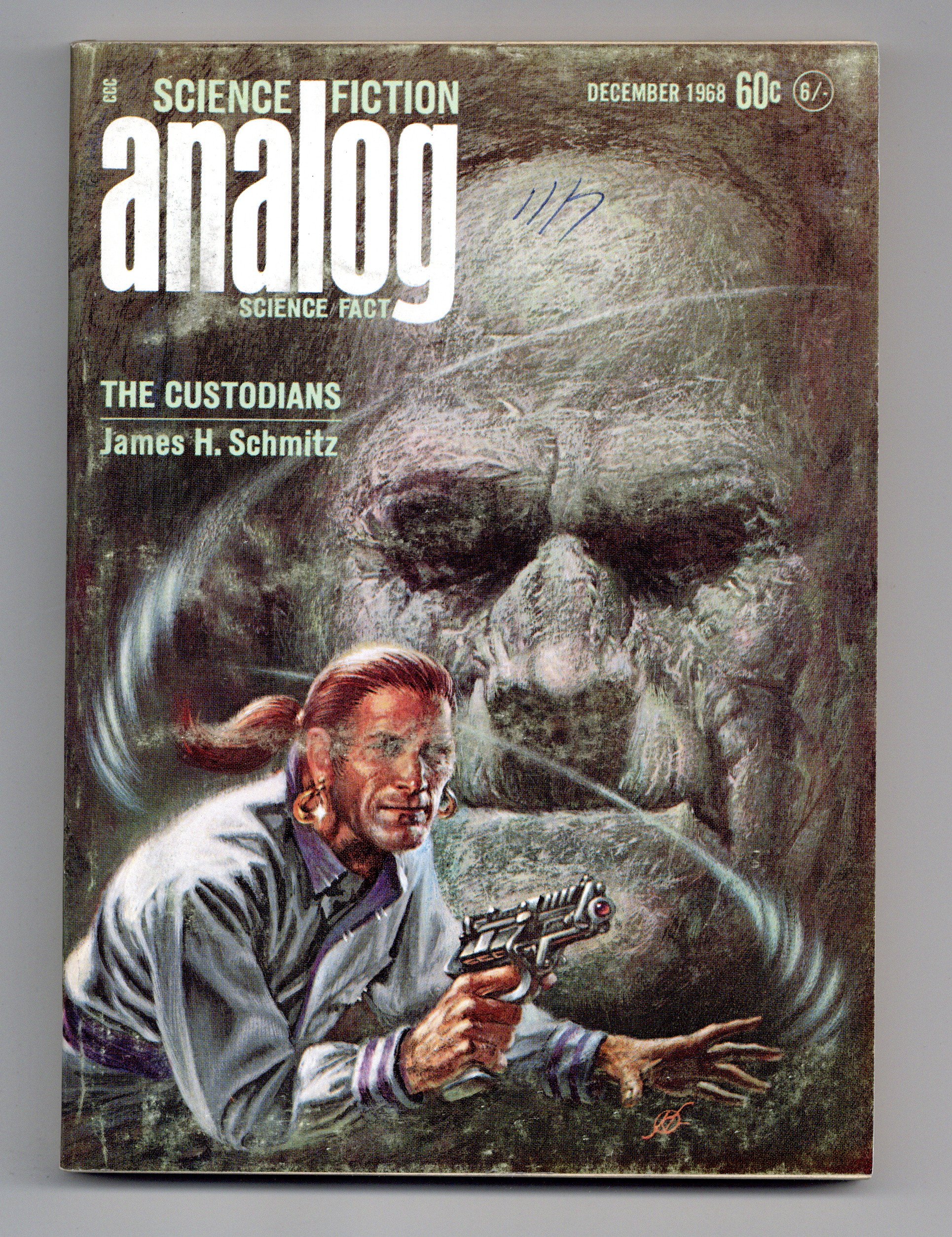 December 1968. Stories: "The Custodians" by James H. Schmitz, "The Reluctant Ambassadors" by Stanley Schmidt, "Pipeline" by Joe Poyer, "A Learning Experience" by Theodore Liltwell, and "The Form Master" by Jack Wodhams. Science Fact feature, "Situation of Some Gravity" by Joseph F. Goodavage. Cover by Kelly Freas. Illustrations by Kelly Freas and Leo Summers. Softcover, 5.5-in. x 7.5-in.; 178 newsprint pages, B&W. Cover price $0.60.