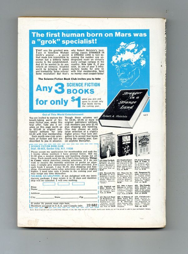 September 1970. Stories: "Star Light" (conclusion) by Hal Clement, "Lost Newton" by Stanley Schmidt, "The Wandering Buoy" by A. Bertram Chandler, "Talk With the Animals" by Stephen Tall, and "Top Billing" by Jack Wodhams. Science Fact article, "Nuclear Power" by Edward C. Walterscheid. Short review of Ellison's "The Best That Shouted Love at the Heart of the World." Cover by Kelly Freas. Illustrations by Kelly Freas and Leo Summers. Softcover, 5.5-in. x 7.5-in.; 178 newsprint pages, B&W. Cover price $0.60.