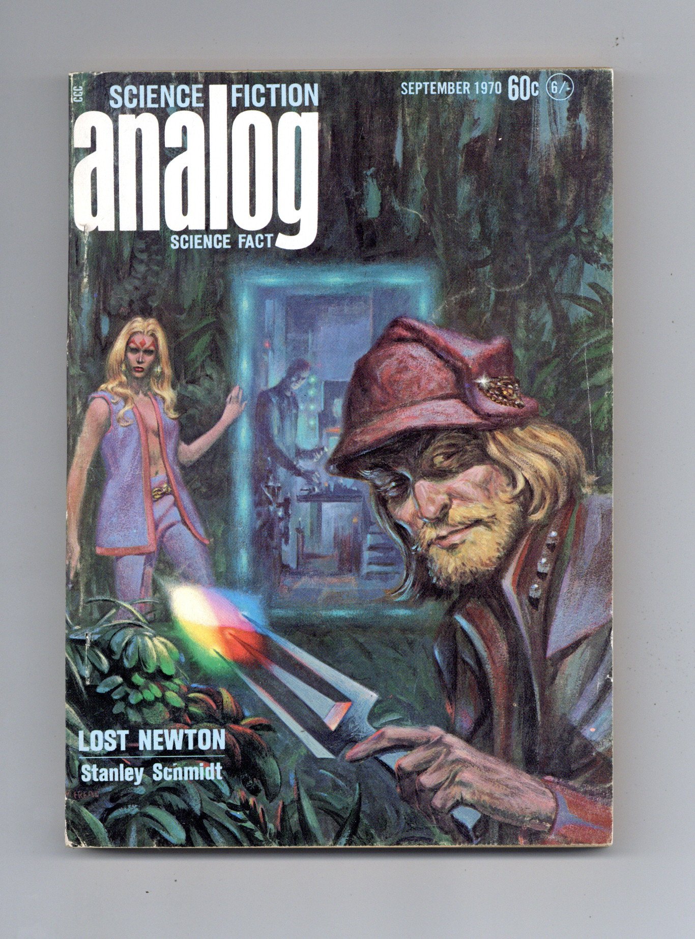 Published Sep 1970 by Dell Magazines.$2.50September 1970. Stories: "Star Light" (conclusion) by Hal Clement, "Lost Newton" by Stanley Schmidt, "The Wandering Buoy" by A. Bertram Chandler, "Talk With the Animals" by Stephen Tall, and "Top Billing" by Jack Wodhams. Science Fact article, "Nuclear Power" by Edward C. Walterscheid. Short review of Ellison's "The Best That Shouted Love at the Heart of the World." Cover by Kelly Freas. Illustrations by Kelly Freas and Leo Summers. Softcover, 5.5-in. x 7.5-in.; 178 newsprint pages, B&W. Cover price $0.60.