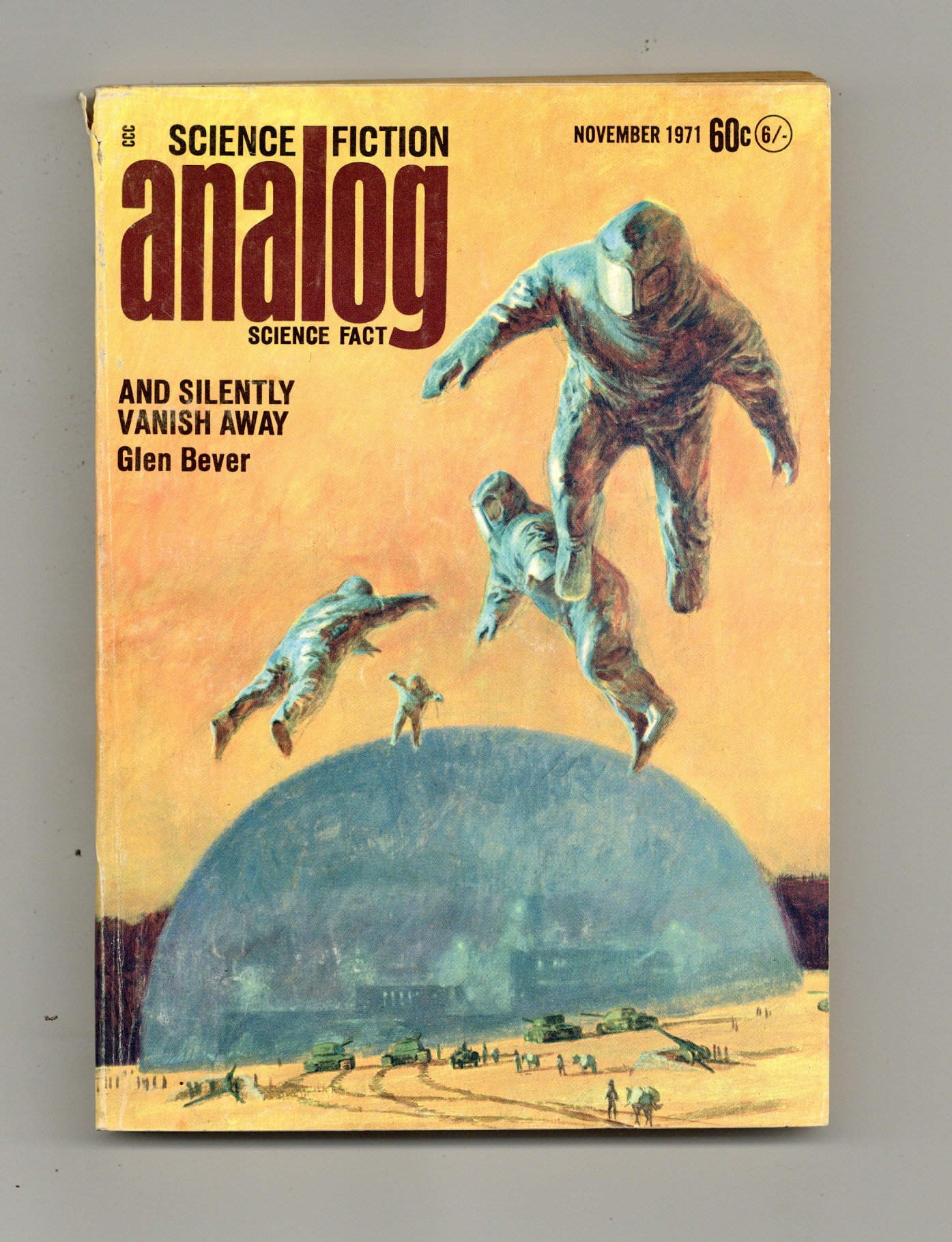 November 1971. Cover by John Schoenherr. Stories: "Hierarchies" (conclusion) by John T. Phillifent, "And Silently Vanish Away" by Glen Bever, "The Old Man of Ondine" by Terrence MacKann, "Compulsion Worse Confounded" by Robert Chilson, "Holding Action" by Andrew M. Stephenson, and "The Nothing Venireman One" by W. Macfarlane. Science Fact article, "In Quest of a Humanlike Robot" by Margaret L. Silbar. Illustrations by John Schoenherr, Kelly Freas, and Leo Summers. Softcover, 5.5-in. x 7.5-in.; 178 newsprint pages, B&W. Cover price $0.60.