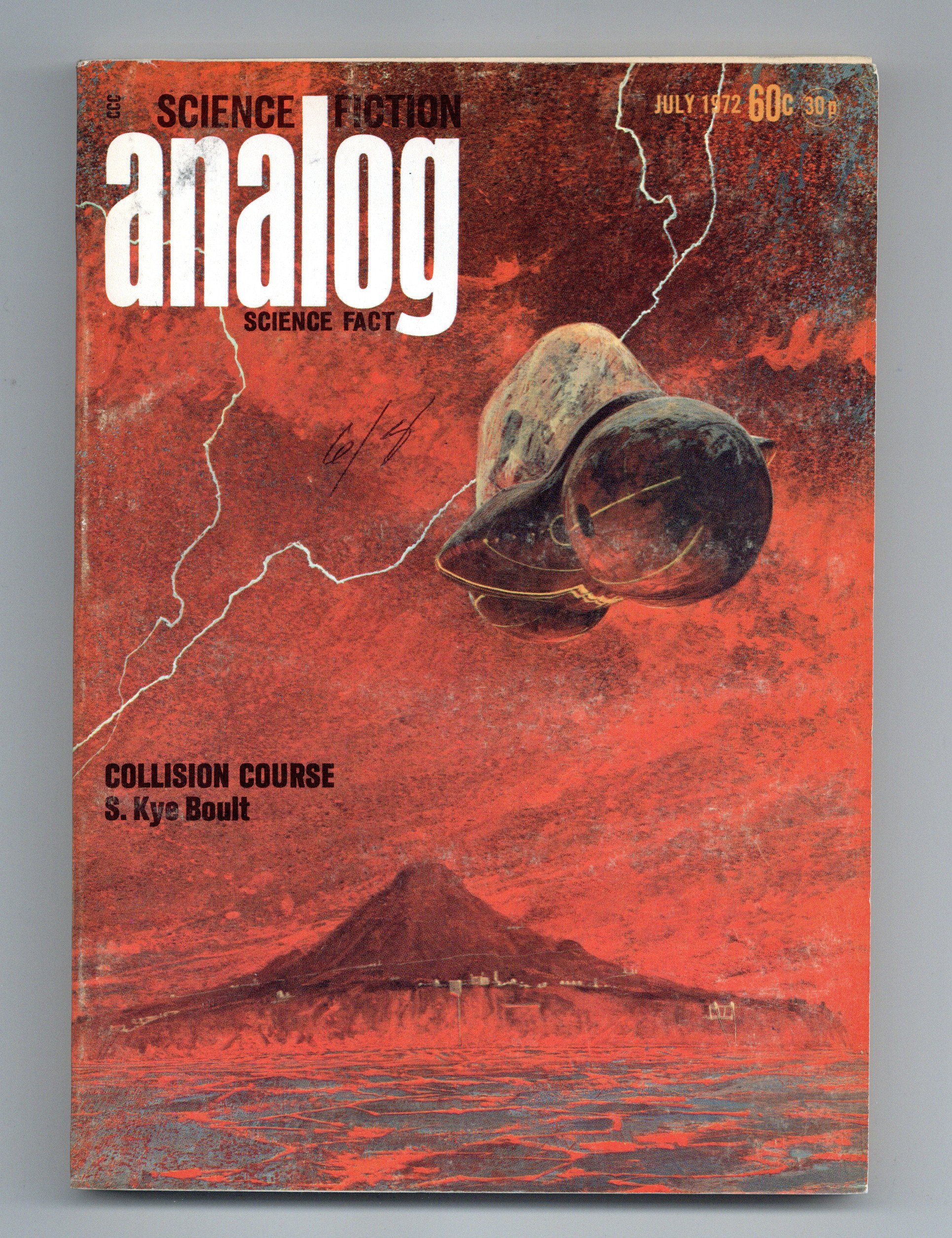 Published Jul 1972 by Dell Magazines.$3.70July 1972. Stories: "Collision Course" by S. Kye Boult, "Count Down" by Laurence M. Janifer, "The Mercenary" by Jerry Pournelle, "Man Off a White Horse" by Howard L. Myers, "Monster in the Waterhole" by Glenn L. Gillette, and "Unfair Trade" by Patrick Welch. Science Fact article, "The Future of Automotive Power Plants" by R.G. Cleveland. Cover by John Schoenherr. Illustrations by Leo Summers, John Schoenherr, Michael Gilbert, and Kelly Freas. Softcover, 5.5-in. x 7.5-in.; 178 newsprint pages, B&W. Cover price $0.60.