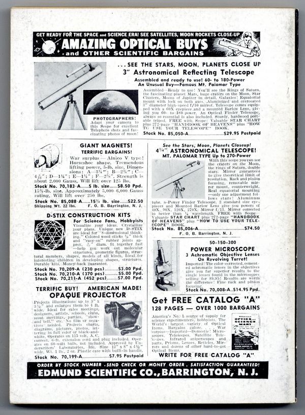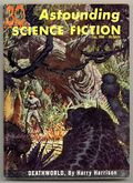 January 1959. Cover by van Dongen. Stories: "Deathworld" (Part1) by Harry Harrison, "The Burning Bridge" by Poul Anderson, "Stress Pattern" by Robert Silverberg, "Attention Saint Patrick" by Murray Leinster, "A Rose By Other Name..." by Christopher Anvil, and "Viewpoint" by Randall Garrett. Science Fact article: "Solid Plutonium Headache". Softcover, 5.5-in. x 7.75-in.; 178 newsprint pages, B&W. Cover price $0.50.