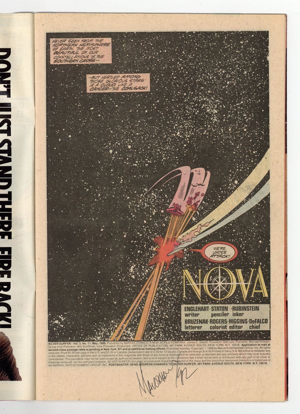 Mark Jeweler Advertisement Insert Variant. "Nova!" Story by Steve Englehart. Art by Joe Staton and Joe Rubinstein. Even though the Heralds of Galactus are imbued with the Power Cosmic, the Silver Surfer teaches Nova (Frankie Ray) the universe is still a very dangerous place. Hopefully Nova will listen to Norrin Radd's council as they've been charged with finding the Contemplator, the last Elder of the Universe. 32 pages. Cover price $0.75.