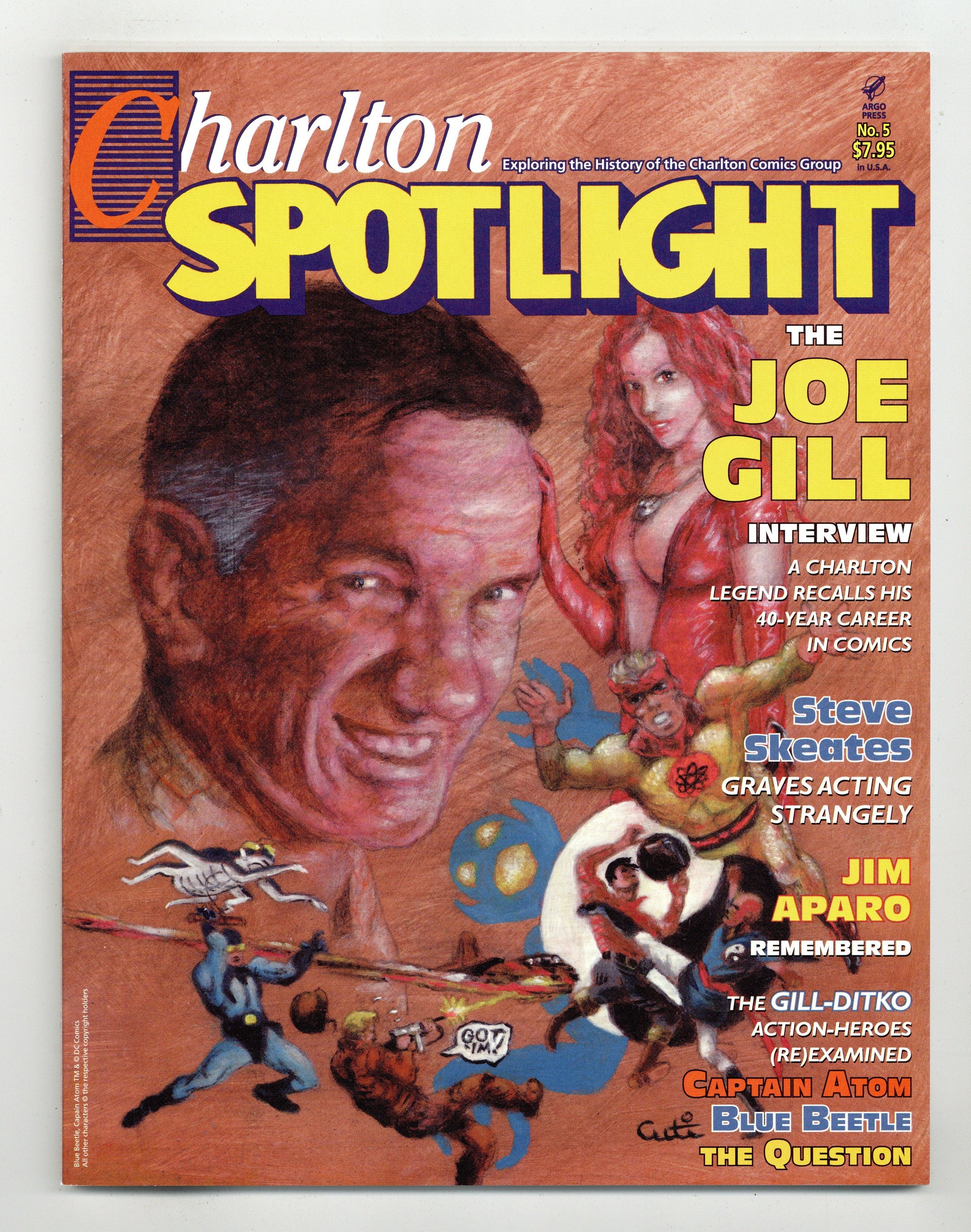 $8.00Printings may vary. The issue all true Charlton fans have been waiting for! Living legend Joe Gill talks to interviewer Jim Amash about his career in comics from the Golden Age to the Bronze and beyond, with behind-the-scenes anecdotes about the artists, editors and publishers Joe knew during his 30+ years and tens of thousands of pages of Charlton stories. Plus: Mark Burbey and Gene Phillips take in-depth looks at the origins of the Gill-Ditko action-heroes Captain Atom, Blue Beetle and The Question; Steve Skeates tells the story behind a story that began as a DC Phantom Stranger adventure and became a Charlton Dr. Graves tale with Marvel-ous overtones in "Graves Acting Strangely"; Ron Frantz recalls his 1980's collaborations with Gill, Ditko, McLaughlin, Toth and (almost) Harlan Ellison; and Steve Skeates returns with a personal memoir of his early Dr. Graves and Thane of Bagarth work with the late, great Jim Aparo. Also: A detailed look at the 1970's Charlton "text stories experiment" by Ramon Schenk and new installments of Nicola Cuti's Weirdlings cartoons and Howard Davis' With Pen & Brush, all wrapped inside a special Joe Gill cover painting by ex-Charlton writer-editor Nicola Cuti. 80 pages, B&W. Cover price $7.95.