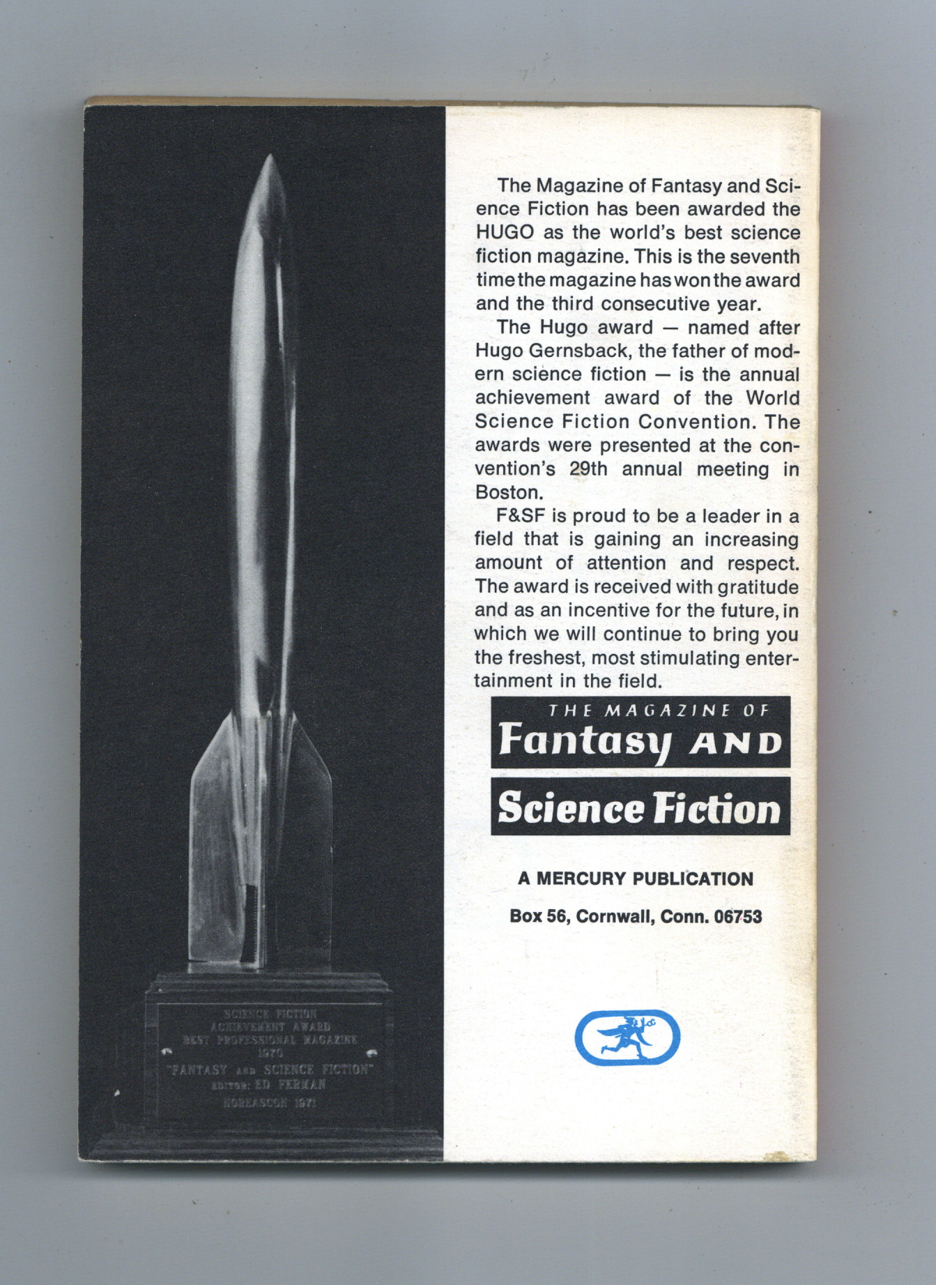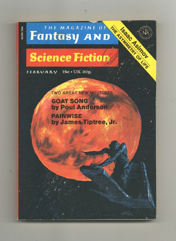 Published Feb 1972 by Mercury Publications.$15.00February 1972. Covr by Bert Tanner. Fantasy and science fiction stories: "Goat Song" by Poul Anderson, "Painwise" by James Tiptree Jr., "Ecce Femina!" by Bruce McAllister, "Dog Days" by Kit Reed, "Gather Blue Roses" by Pamela Sergent, "The Elseones" by Dennis O'Neil, and Cosmic Sin" by Dean R. Koontz, "Science: The Asymmetry of Life" by Isaac Asimov. Book reviews by James Blish. Film review for "The Gladiators" by Baird Searles. 5-in. x 7-in., black and white; 146 pages. Cover price $0.75.