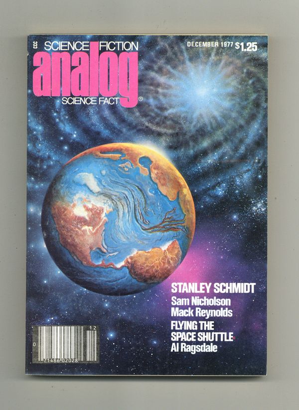 Published Dec 1977 by Dell Magazines.$8.49December 1977. Cover by Rick Sternbach. Stories: "Of Future Fears"(conclusion) by Mack Reynolds, "Dark Age" by Stanley Schmidt, "Then and Now" by Raymond Z. Gallun, "Now You See Her" by Sam Nicholson, and "Antithiotimoline" by Topi H. Barr. Science Fact article, "Flying the Space Shuttle" by Al Ragsdale. Illustrations by Attila Hejja, Jack Gaughan, Mike Hinge, and Vincent Di Fate. Softcover, 5.5-in. x 7.5-in.; black and white; 178 newsprint pages. Cover price $1.25.