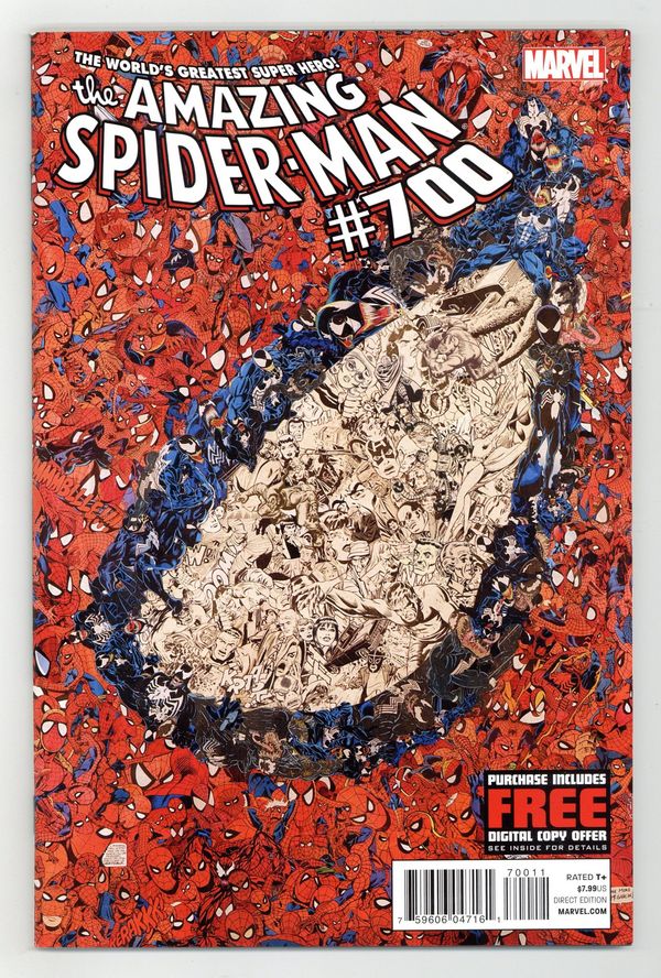 Direct Edition. Dying Wish: Part 2 of 2. Written by Dan Slott, J.M. DeMatteis and Jen Van Meter. Art by Humberto Ramos, Giuseppe Camuncoli, Stephanie Buscema, Victor Olazaba and Sal Buscema. Cover by Mr Garcin. Marvel Comics proudly presents the end of a 700 issue era! Featuring "Dying Wish: Suicide Run" by Dan Slott, Humberto Ramos and Victor Olazaba. Plus these extra amazing, spectacular and sensational stories: "Spider-Dreams" by J.M. DeMatteis, Giuseppe Camuncoli and Sal Buscema, and "Date Night: A Black Cat Storybook Adventure!" by Jen Van Meter and Stephanie Buscema. Also: cover gallery featuring all 700 Amazing Spider-Man covers; special previews of the all-new Spidey books; and the final Amazing Spider-Mail featuring Stan "The Man" Lee answering your questions! 104 pages, full color. Rated T+ Cover price $7.99.