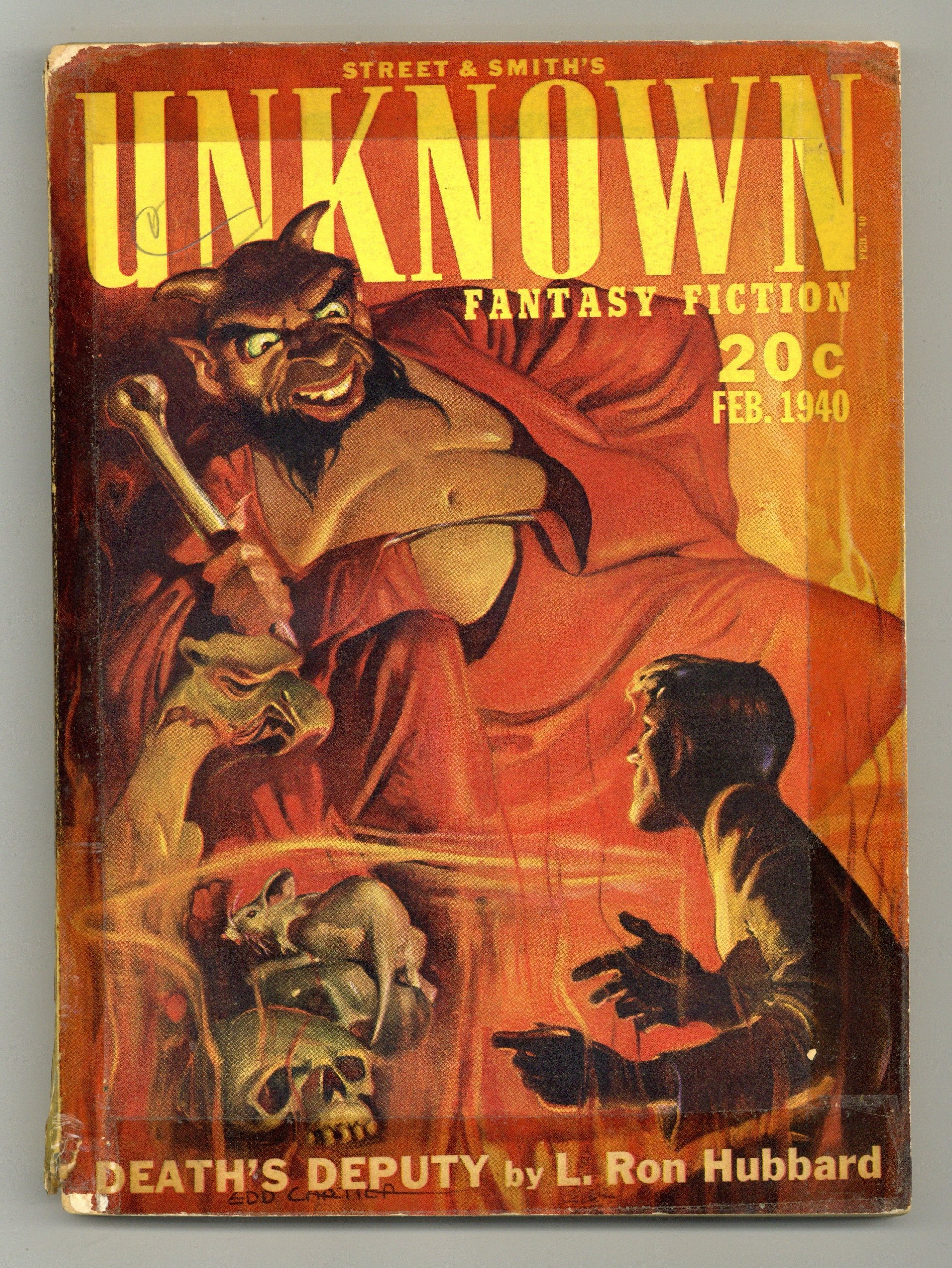 February 1940. The title was changed from "Unknown" to "Unknown Fantasy Fiction" this issue. Cover by Edd Cartier. Fantasy stories: "Death's Deputy" by L. Ron Hubbard, "The Wisdom of an Ass" by Silaki Ali Hassan, "Call of Duty" by Laurence Bour, Jr., "The Psychomorph" by E.A. Grosser, "When It Was Moonlight" by Manly Wade Wellman, and "On The Knees of the Gods" (Part 2 of 3) by J. Allan Dunn. Poetry: "Lurani" by Paul Dennis Lavond. Illustrations by Cartier, Finlay, M. Isip and R. Isip. Softcover Pulp, 6 1/2-in x 9-in, 162 Pages, B&W. Cover price $0.20.