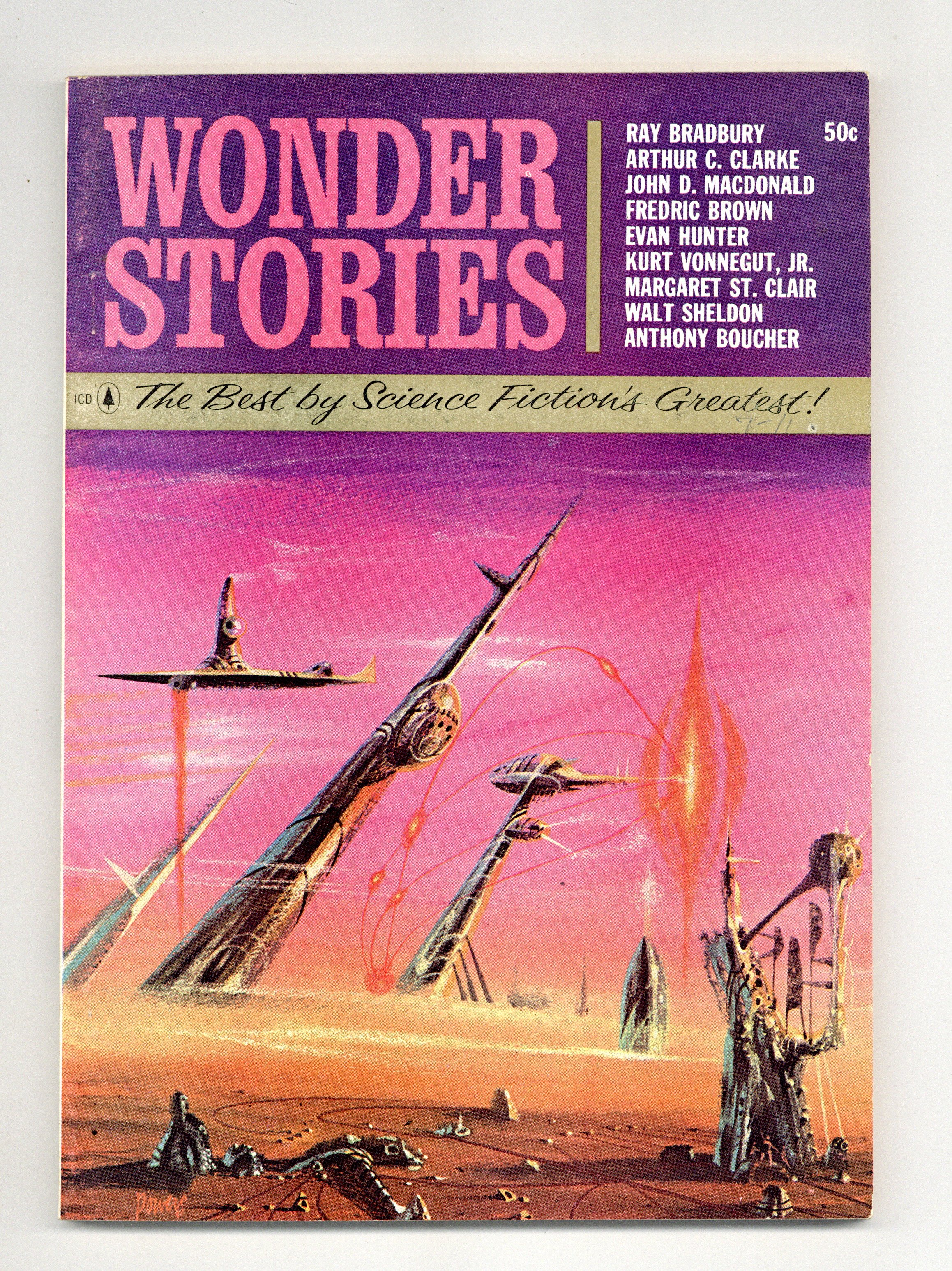 Volume 45, Issue 2 - 1963. Science Fiction and fantasy anthology book featuring the stories "Shadow on the Sand" by John D. Macdonald, "A Sound of Thunder" by Ray Bradbury, "All the Time in the World" by Arthur C. Clarke, "Man of Distinction" by Fredric Brown, "Thanasphere" by Kurt Vonnegut Jr., "The Hunters" by Walt Sheldon, "The Monitor" by Margaret St. Clair, Robert by Evan Hunter, and "Starbride" by Anthony Boucher. 96 pages, Text only. Cover price $0.50.