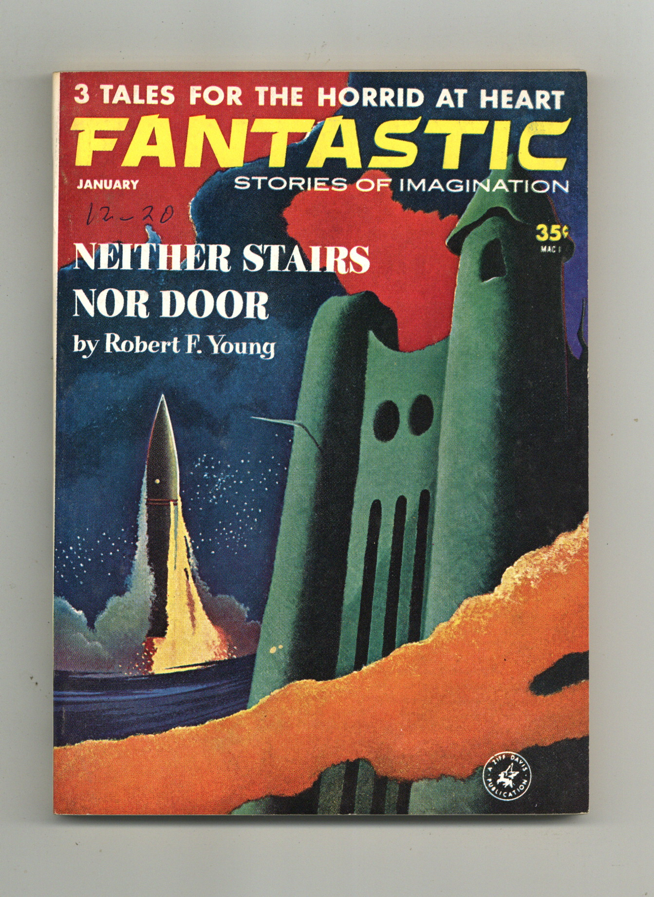 Published Jan 1963 by Ziff Davis.$16.00Volume 12, Issue 1 - January, 1963. Cover by Vernon Kramer. Features "Neither Stairs Nor Door" by Robert F. Young. 5.5-in. x 7.75-in.; black and white; 128 newsprint pages. Cover price $0.35.