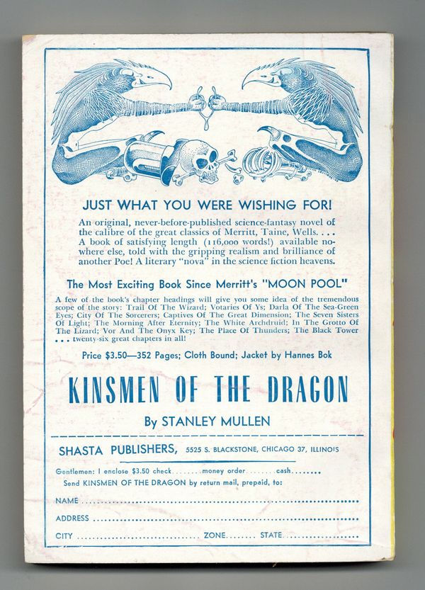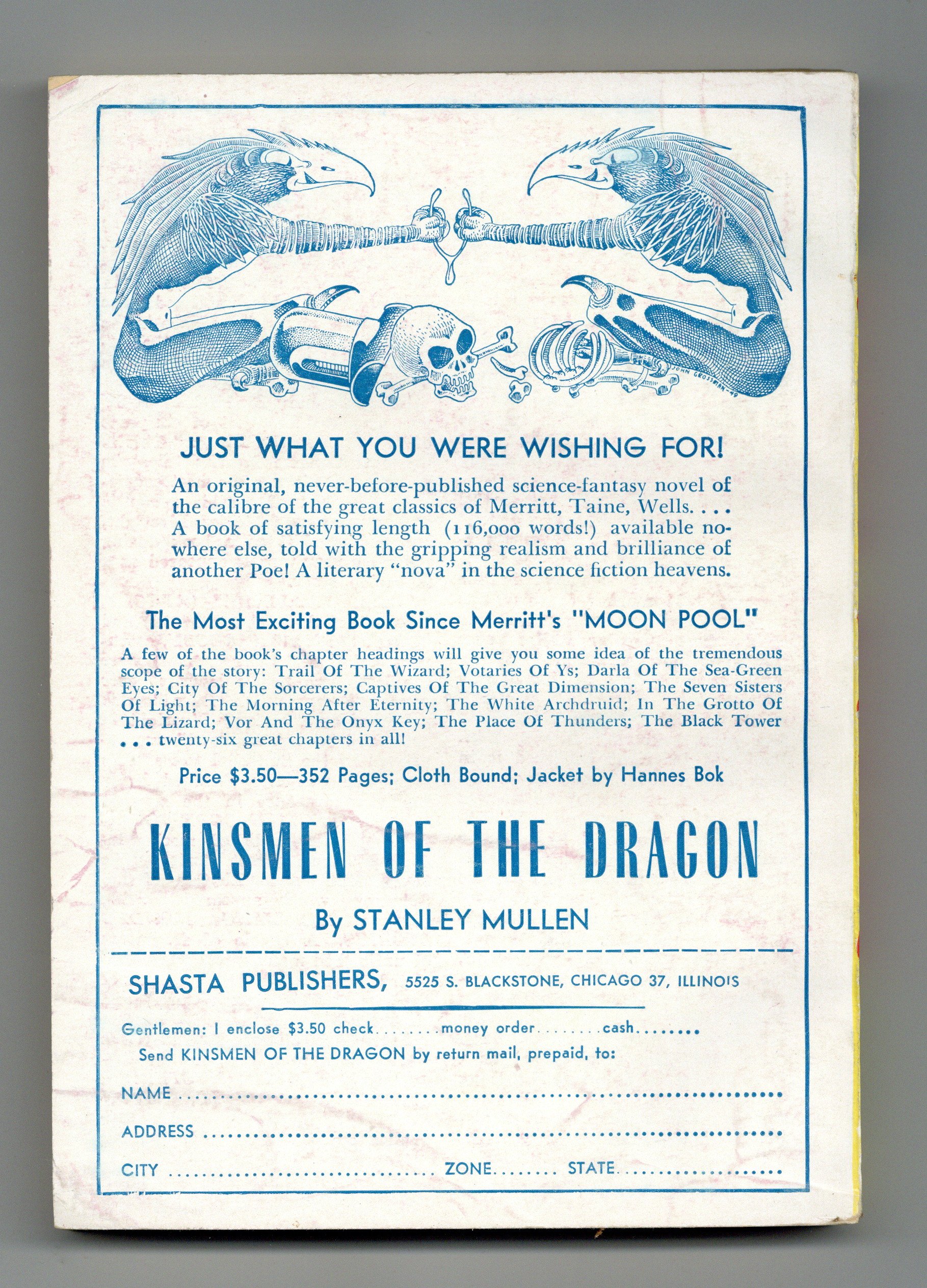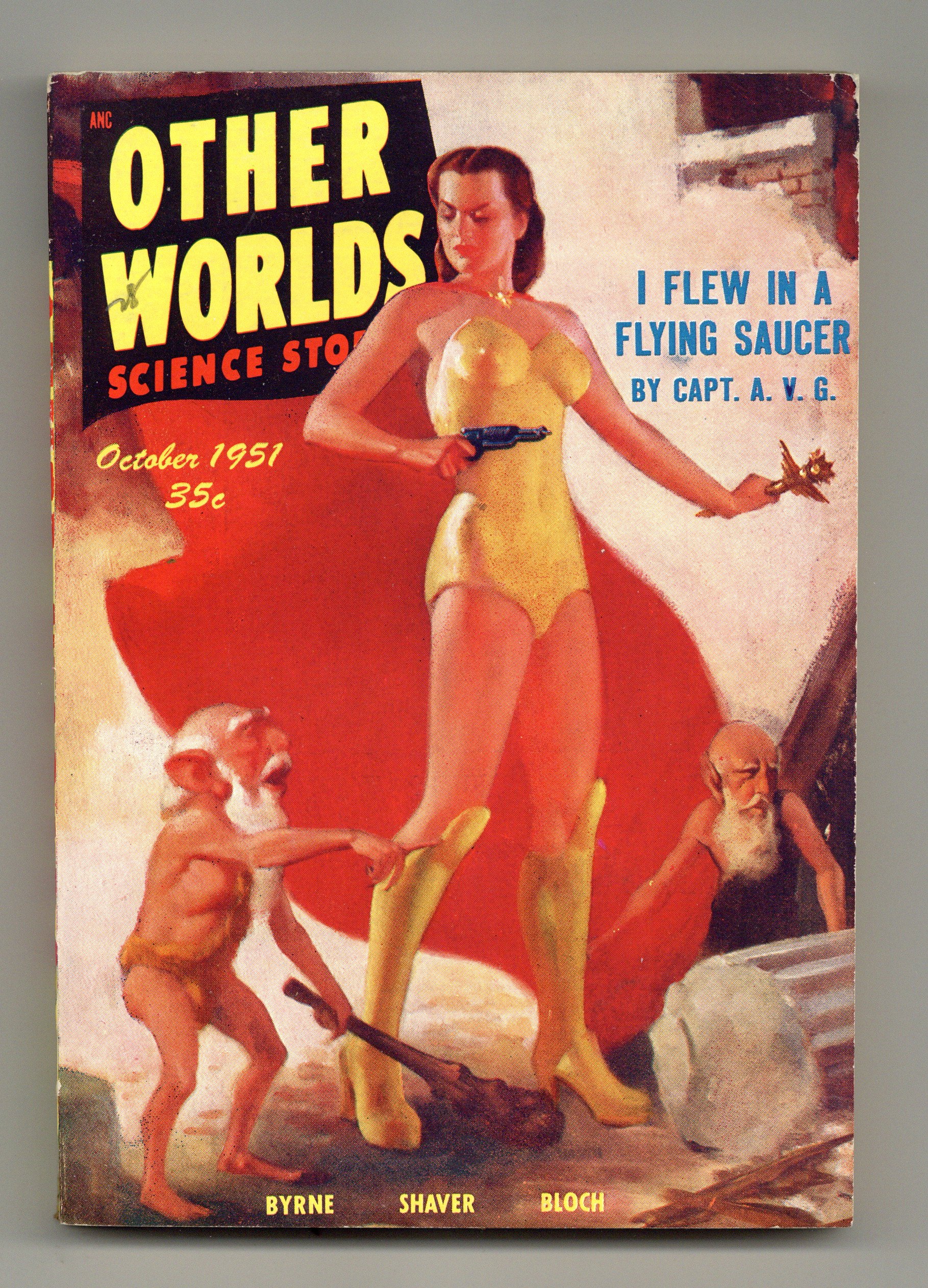 Published Oct 1951 by Clark Publishing Company.$16.00October 1951; Volume 3, No 6 / Issue 14. Cover by H. W. McCauley. "The End of Science Fiction" by Robert Bloch and other Science Fiction stories by Jaquel Kennedy, Richard S. Shaver & Chester S. Geier, Raymond Palmer (as Captain A.V.G.), S. J. Byrne, Willy Ley, Richard Shaver, and David Gordon. Interior illustrations by Carl Kidwell, D. Bruce Berry, W. E. Terry, and Jon Arfstrom. 5 1/4-in. x 7 1/2-in.; black and white; 162 pages. Cover price $0.35.
