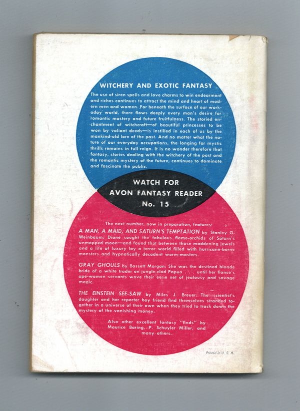 Published Nov 1950 by Avon Books.$20.00November, 1950. "Temptress of the Tower of Torture and Sin!" Written by Robert E. Howard. Also featuring works by Ray Bradbury, Zealia Bishop and H. P. Lovecraft. Softcover, 5-in. x 7 1/2-in., 132 pages, Text with B&W illustrations. Cover price $0.35.
