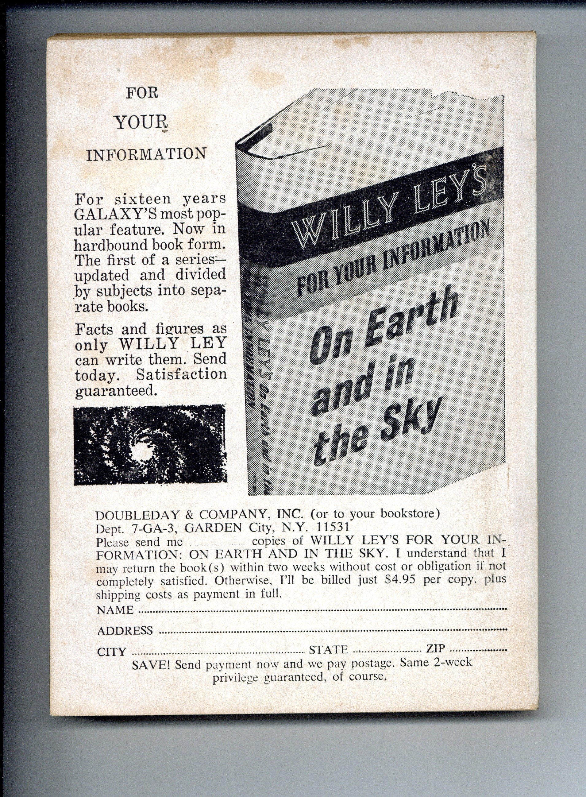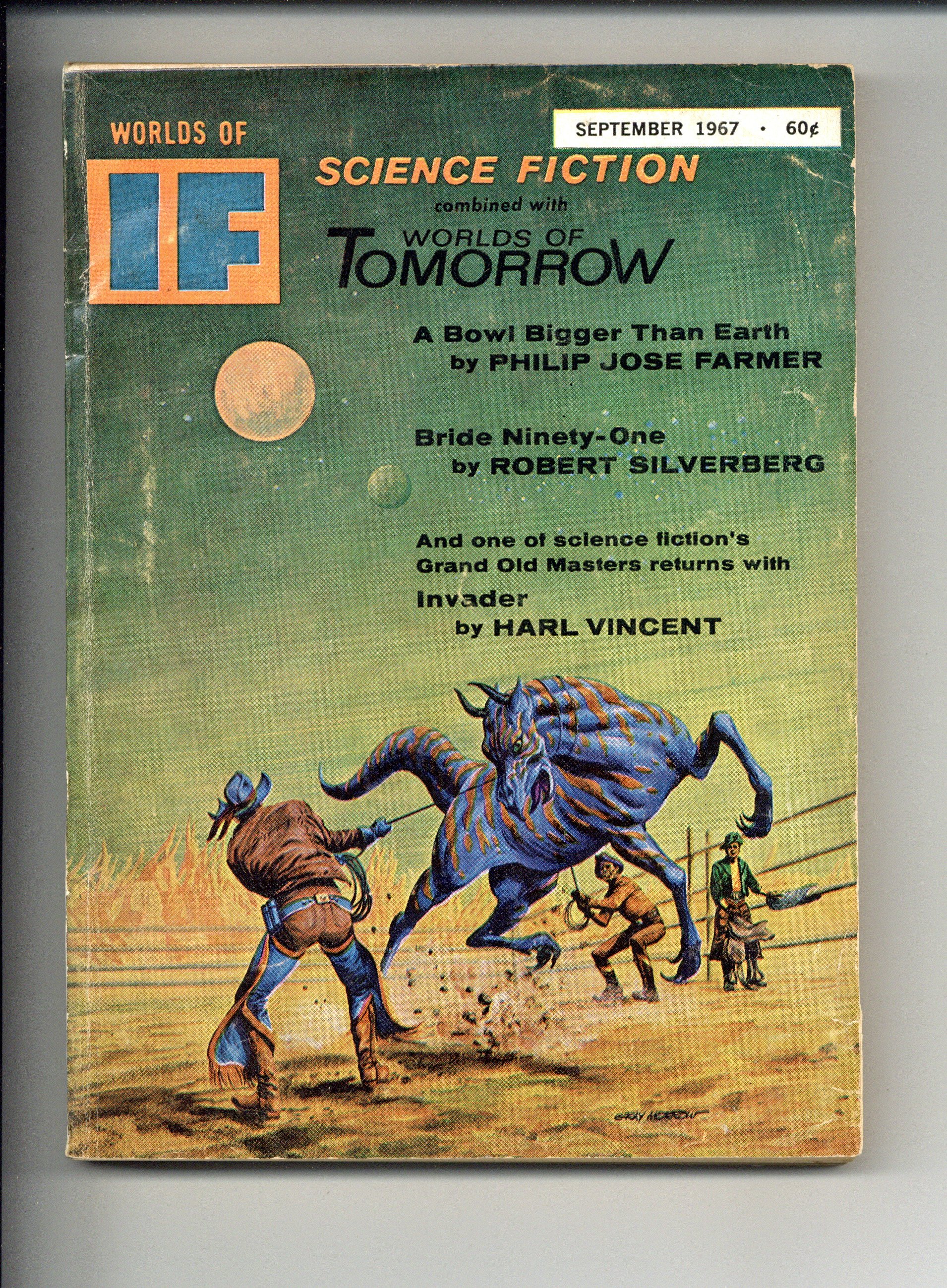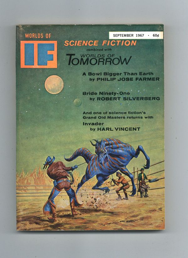 Published Sep 1967 by Quinn Publishing Co..$16.00September 1967. Cover by Morrow. Stories: "The Fortunes of Peace" by C. C. MacApp, "To Serve the Masters" by Perry A Chapdelaine, "Venus Smiles" by J. G. Ballard, "A Bowl Bigger Than Earth" by Philip Jose Farmer, "Invader" by Harl Vincent, "Faust Aleph-Null" by James Blish, and "Bride Ninety-One" by Robert Silverberg. 5.25-in. x 7.5-in.; 162 Pages, B&W. Cover price $0.60.