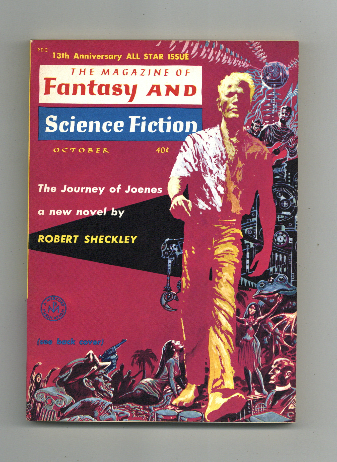 October 1962. Cover by Ed Emsh. Fantasy and science fiction stories: "A Kind of Artistry" by Brian W. Aldiss, "There Was an Old Woman Who Lived in a Shoe" by Robert F. Young, "24 Hours in a Princess's Life, With Frogs" by Don White, "Inquest in Kansas" by Hyacinthe Hill, "Measure My Love" by Mildred Clingerman, "Science: Slow Burn" by Isaac Asimov, Monthly essay "Books" by Avram Davidson, "The Unfortunate Mr. Morky" by Vance Aandahl, "Ferdinand Feghoot: LV" by Grendel Briarton, "The Journey of Joenes" (Part 1 of 2) by Robert Sheckley. Softcover, 5-in. x 7-in., 130 newsprint pages, B&W. Cover price $0.40.