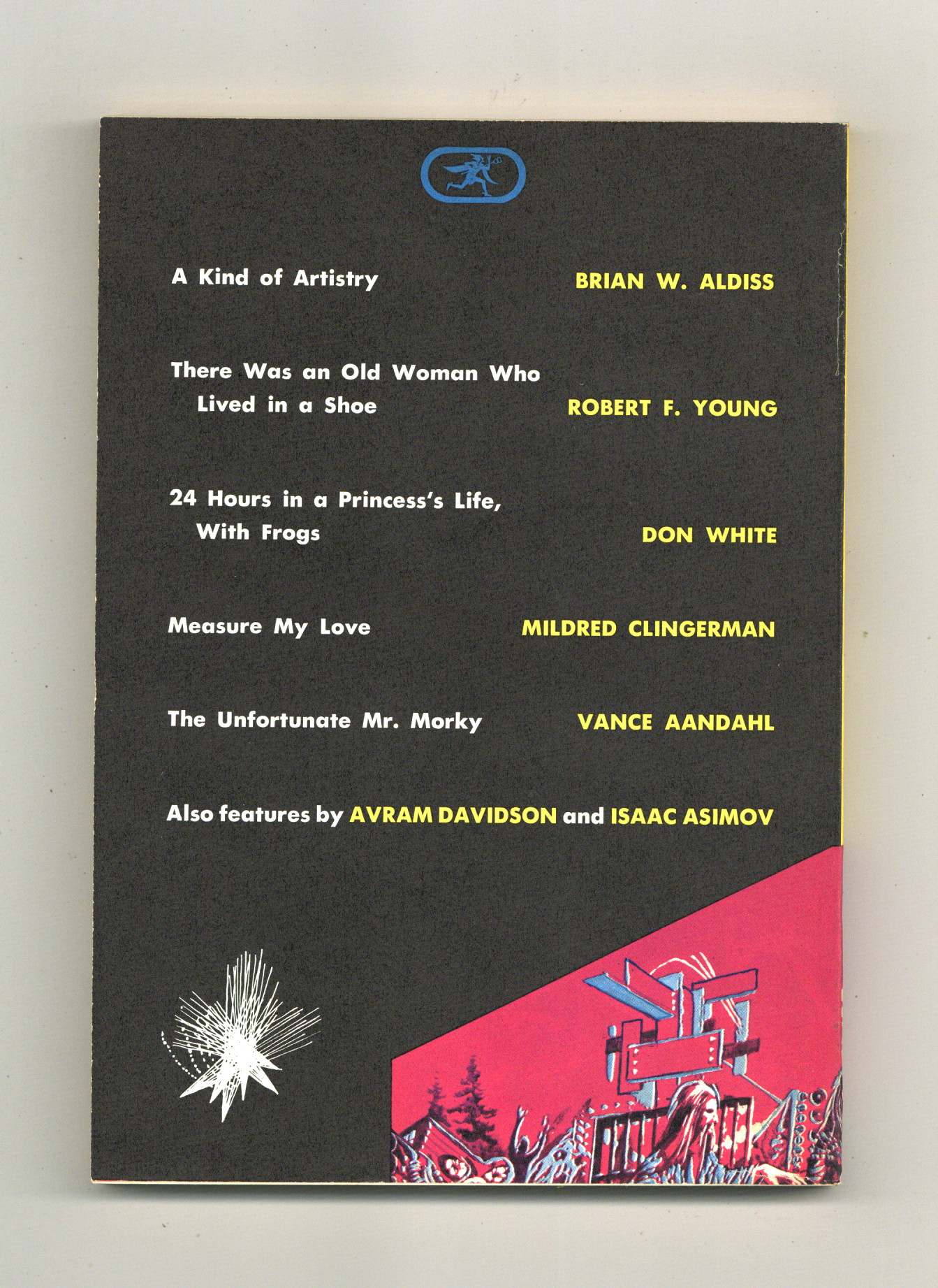 Published Oct 1962 by Mercury Publications.$28.00October 1962. Cover by Ed Emsh. Fantasy and science fiction stories: "A Kind of Artistry" by Brian W. Aldiss, "There Was an Old Woman Who Lived in a Shoe" by Robert F. Young, "24 Hours in a Princess's Life, With Frogs" by Don White, "Inquest in Kansas" by Hyacinthe Hill, "Measure My Love" by Mildred Clingerman, "Science: Slow Burn" by Isaac Asimov, Monthly essay "Books" by Avram Davidson, "The Unfortunate Mr. Morky" by Vance Aandahl, "Ferdinand Feghoot: LV" by Grendel Briarton, "The Journey of Joenes" (Part 1 of 2) by Robert Sheckley. Softcover, 5-in. x 7-in., 130 newsprint pages, B&W. Cover price $0.40.