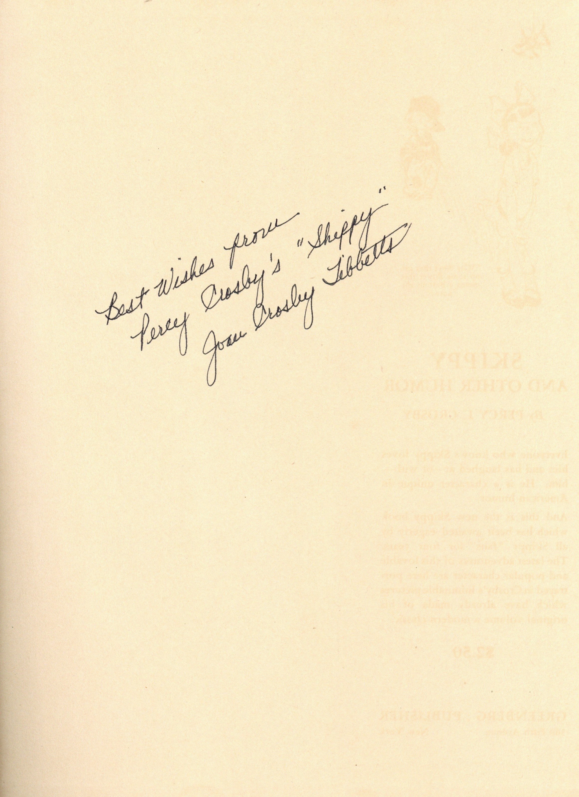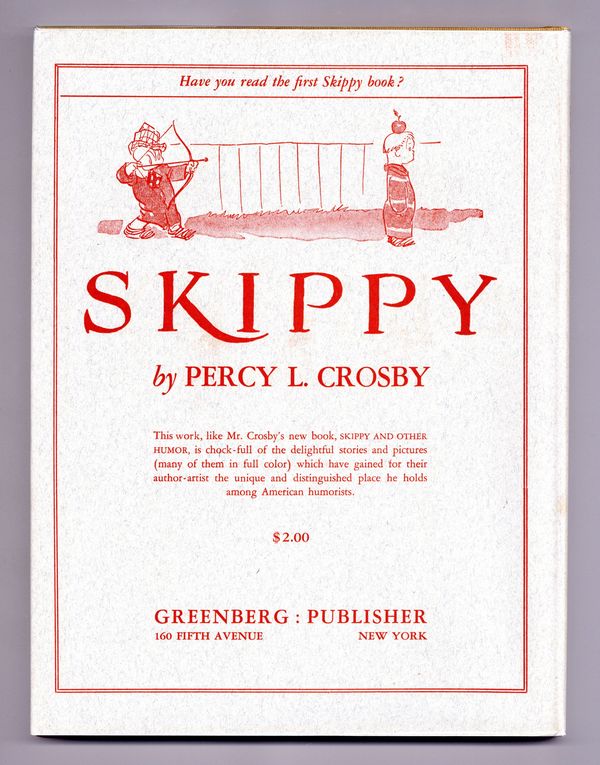 Published 1929 by Greenberg Publishers.$250.001st Edition - 1929. Written and illustrated by Percy L. Crosby. Skippy was a popular comic strip running from 1923-1945 and was an early inspiration for Charles Schultz and his creation, Peanuts. Hardcover with dust jacket, 11-1/4" x 8-5/8", 72 pages, PC/PB&W. Cover price $2.50.
