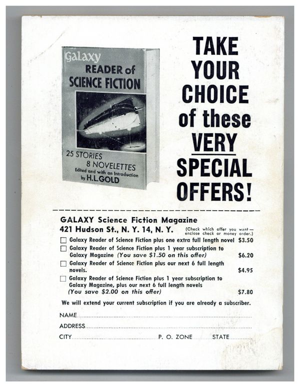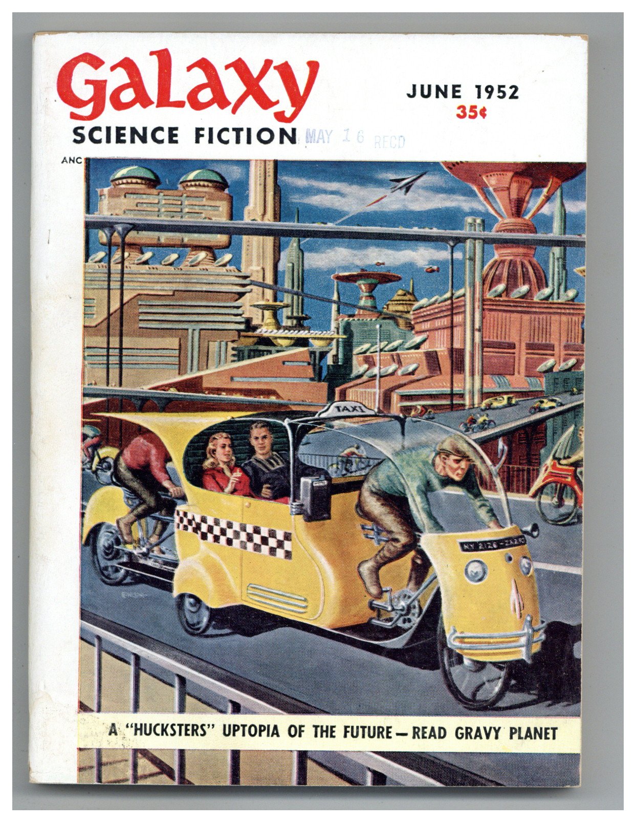 Published Jun 1952 by Galaxy Publications.$12.50June 1952. Cover by Emsh. Stories: "Gravy Planet"(Part 1) by Frederik Pohl and C. M. Kornbluth, "Orphans of the Void" by Michael Shaara, "The Hoaxters" by Ricard Wilson, "The Highest Mountain" by Bryce Walton, "Shipping Clerk" by William Morrison, and "The Luckiest Man in Denv" by Simon Eisner. 5.25-in. x 7.5-in.; 160 Pages, B&W. Cover price $0.35.