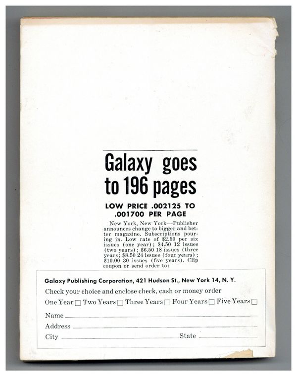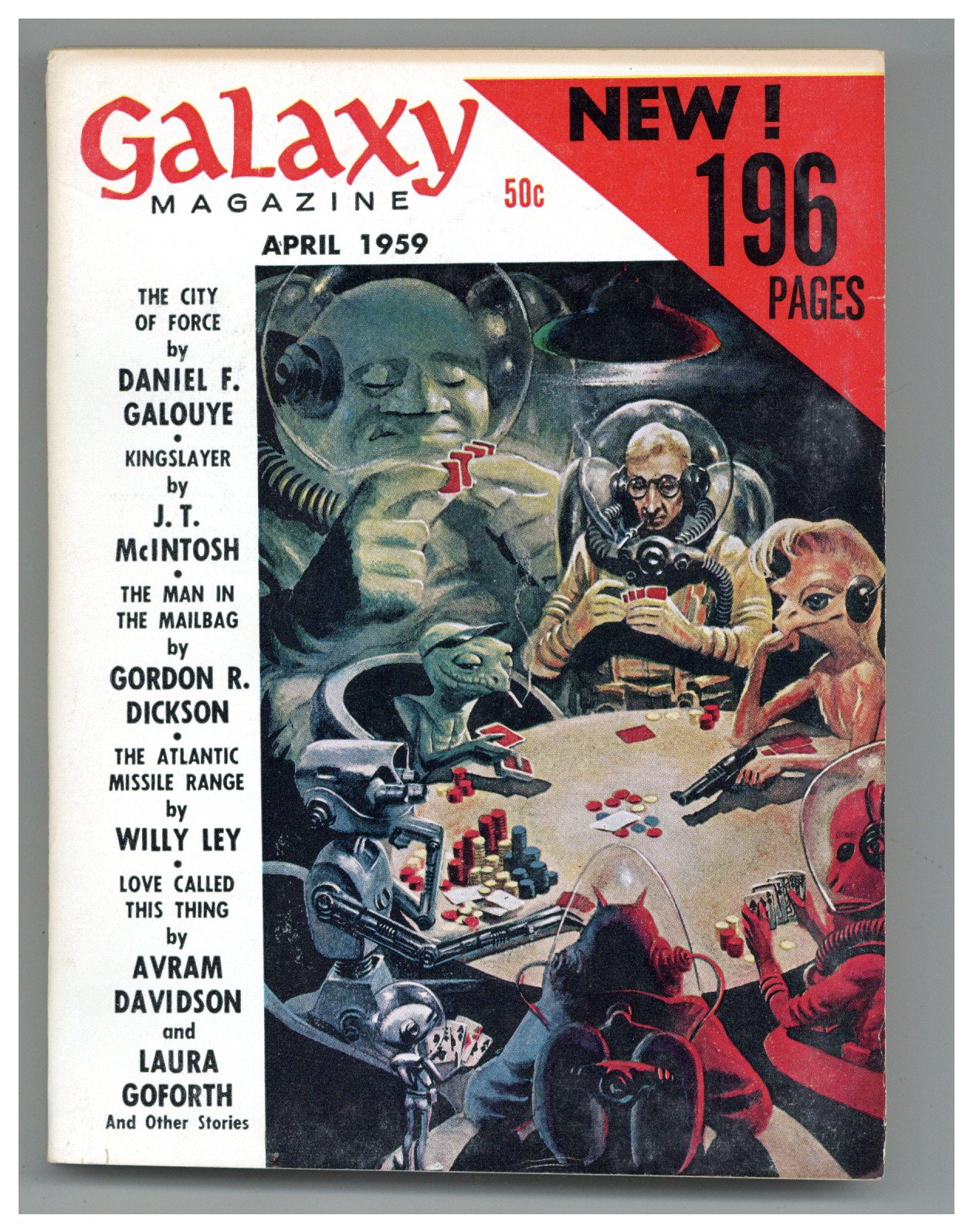 Published Apr 1959 by Galaxy Publications.$8.00April 1959. Cover by Wood. Stories: "The City of Force" by Daniel F. Galouye, "Kingslayer" by J. T. McIntosh, "The Man in the Mailbag" by Gordon R. Dickson, "Security Plan" by Joseph Farrell, "The Bitterest Pill" by Frederik Pohl, "Love Called This Song" by Avram Davidson and Laura Goforth, "The Sweeper of Loray" Finn O'Donnevan, and "When the People Fell" by Cordwainer Smith. 5.25-in. x 7.5-in.; 194 Pages, B&W. NOTE: Cover claims 196 pages, this includes the covers. Cover price $0.50.