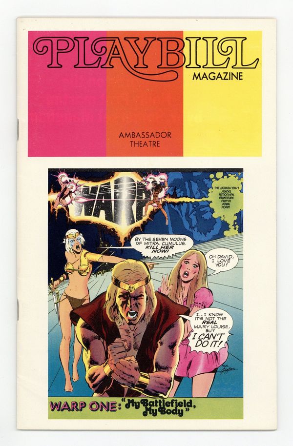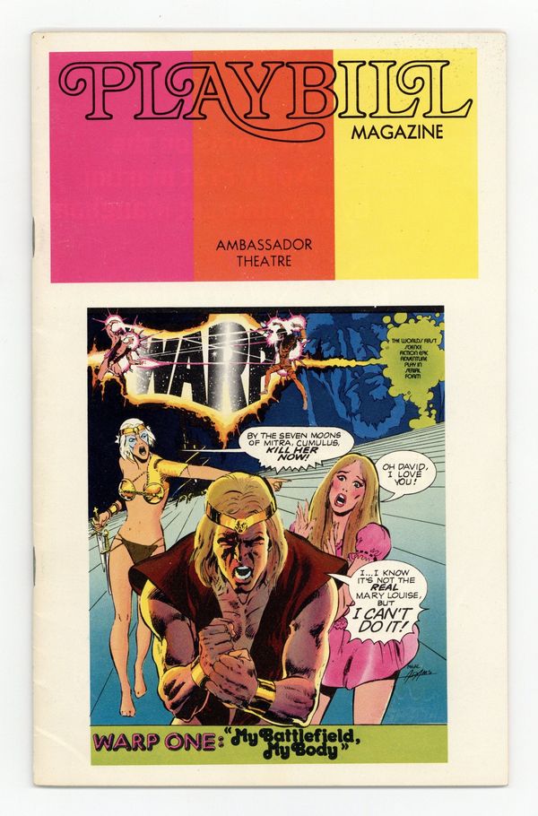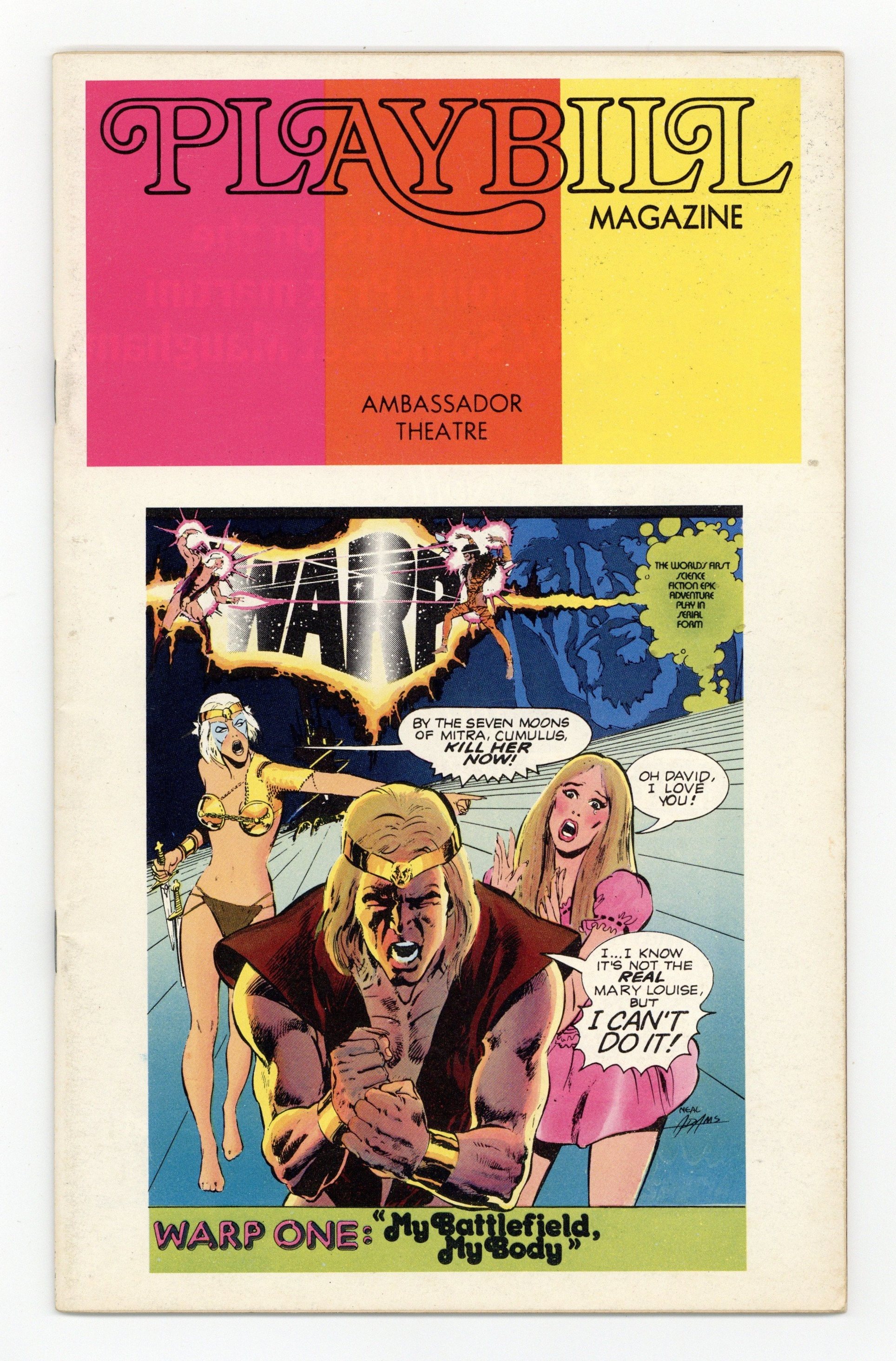 Cover by Neal Adams. Playbill Magazine (Volume 10, Issue 20 for the 1973 Broadway opening of the play "Warp One: My Battlefield, My Body", the first of the trilogy that inspired the 1983 comic series. Given out at the Ambassador Theatre to promote the show, list the cast credits, and inform audience members of other upcoming productions. 44 pages, PC/PB&W.