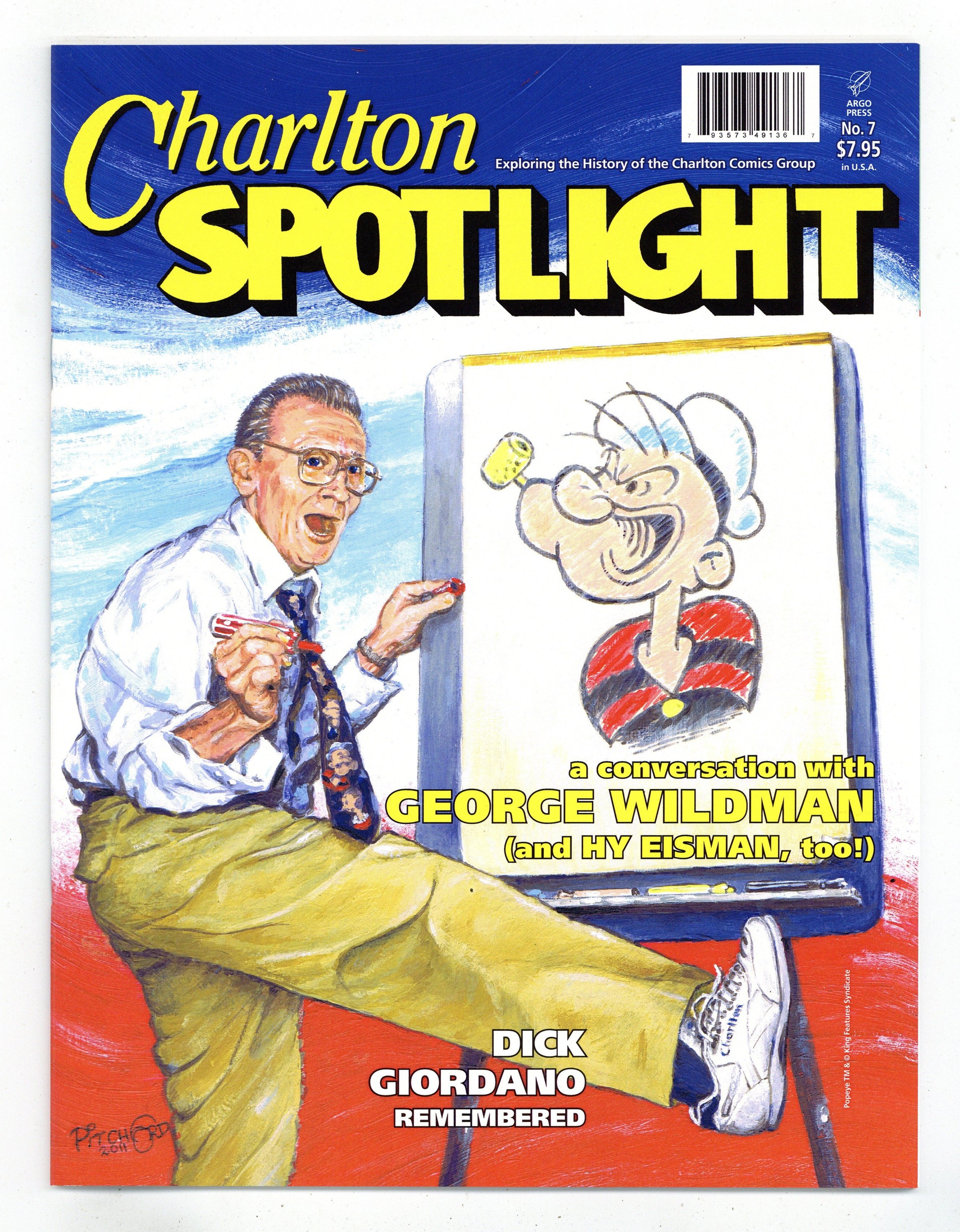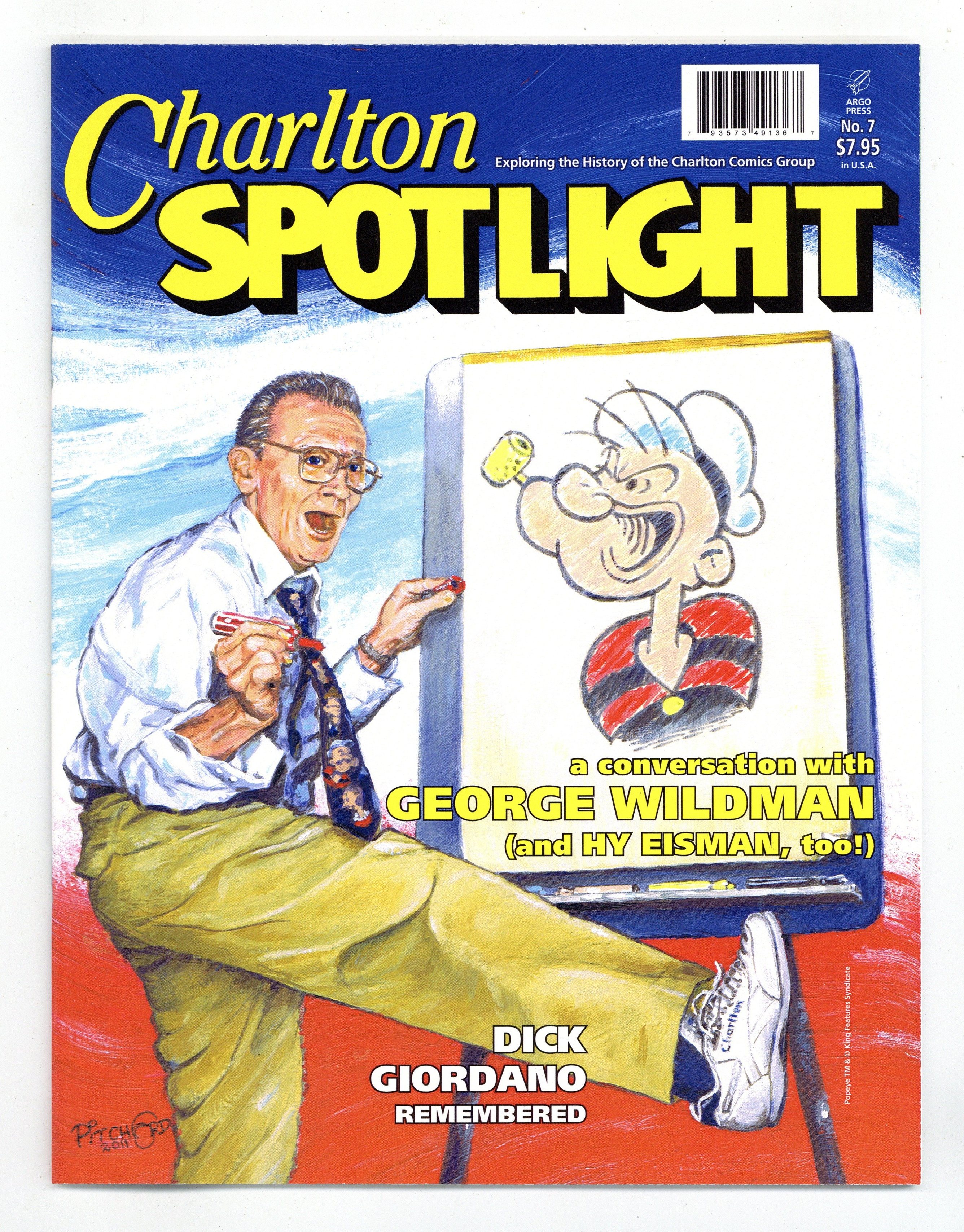 $9.50Printings may vary. This issue features a lively, lengthy conversation with George Wildman, Charlton Comics' last and greatest editor, with cartoonist Hy Eisman sitting in. George reminisces on his long tenure at Charlton, from his selection as Popeye artist to his term as Charlton's managing editor, from his early advertising career and his 1950s Charlton work to candid comments on the creators he worked with. We also his post-Charlton career in children's books to the specialty educational work he's doing today. 40 pages Cover price $7.95.