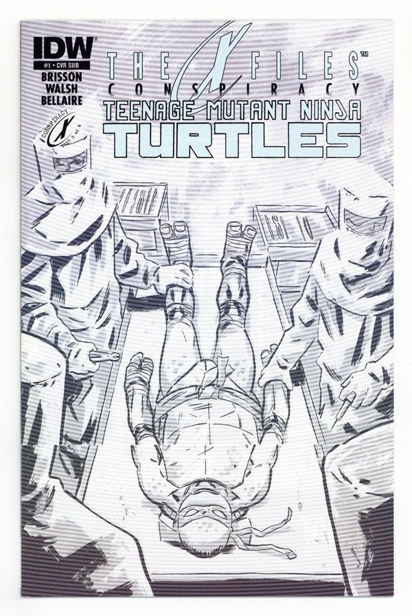 Published Feb 2014 by IDW Publishing.$17.50Variant Cover by Michael Walsh (W) Ed Brisson (A) Michael Walsh. The Turtles are doing their best to avoid trouble in Northampton. Unfortunately, trouble finds them in the form of the Lone Gunmen! The fate of the world depends on the Gunmen getting the reclusive Turtles' help. Add in an undead menace and things are going to get downright dangerous! Cover price $3.99.